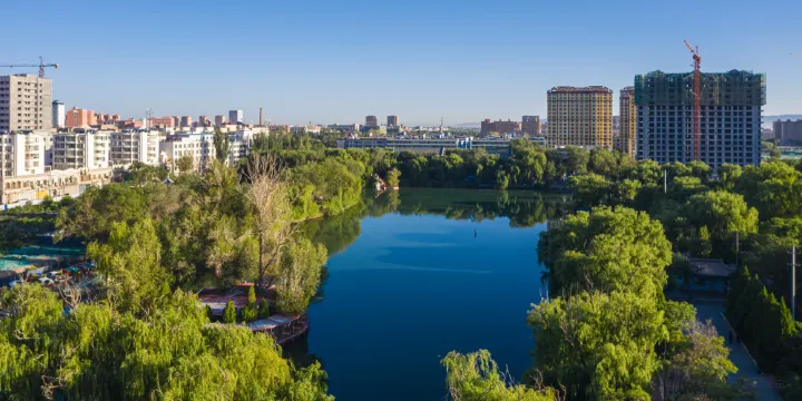 位於張掖市縣府北街北端,始建於1984年,佔地面積299畝。南北中軸網上各開一園門。南門為正門,前接縣府北街,北門前臨環城北路,兩門內由寬甬道連通。甬道上,南連蔭牆,北建拱橋,東西二湖在橋下相通。進南門後,左側(西)有草坪、花苑、噴泉及方塘,塘北一橋接島於西湖,島上建亭。方塘再西有樓閣三座,麪東兩座,麪南一座,西北相鄰,為茶園書會。湖西至北門,沿湖也有亭樹台殿之勝。進南門右側(東)有小童樂園。過蔭牆後,漸近拱橋,道左為西湖水域,道右有花圃及姊妹亭。亭東、北即東湖。亭南有道可通湖南。湖南地廣,多植松杉奇樹,曲徑通幽。東南有丘,上建四角望亭,可盡攬全園景色。過拱橋後,道左為假山諸勝,右側往東有曲橋六角亭,由東湖北沿向南伸至湖中。