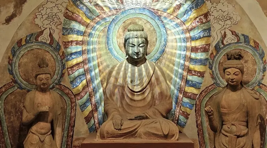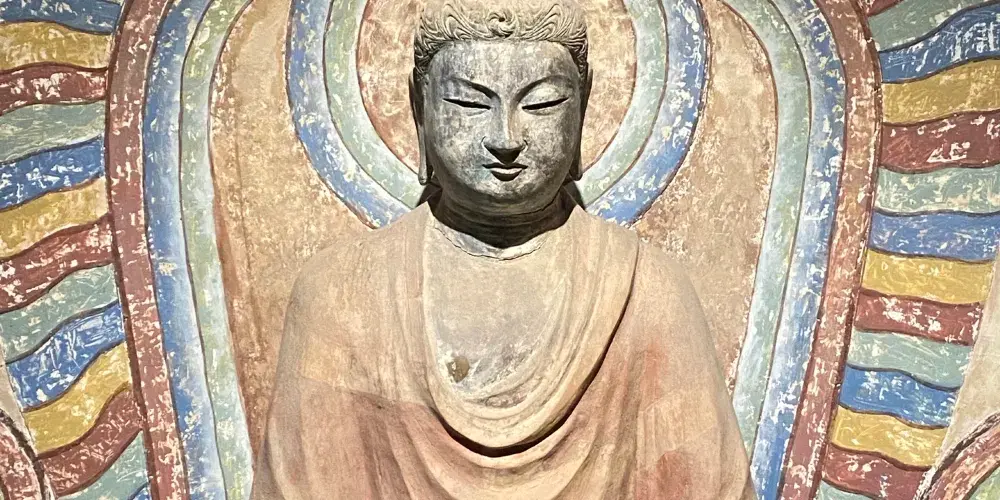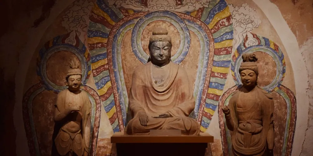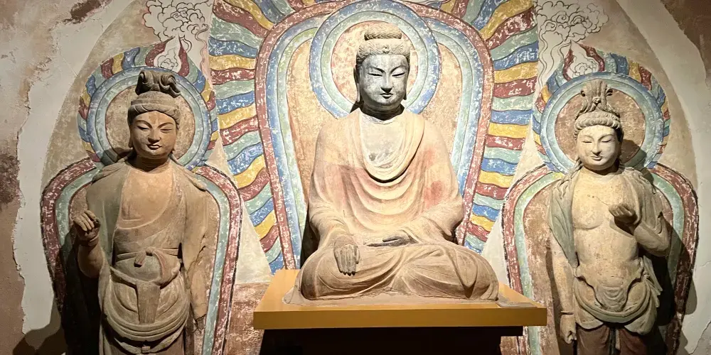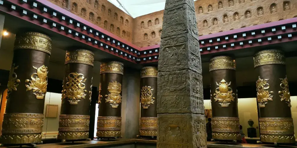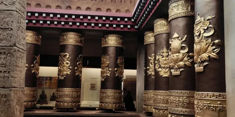 甘肅佛教藝術展位於三樓,亦是館內的重要展覽,這裡有從莫高窟、麥積山石窟複製而來的石窟,藏傳佛教巨大的白塔和轉經筒等等,走進展館恍如置身於一座輝煌宏偉的寺院。館內展示的佛像、法器等都十分精美,既有漢傳佛教的歷史文物,也有藏傳佛教珍貴的宗教器物,這樣的融合只有在甘肅這樣漢藏交融的地帶才能看到,極具特色。