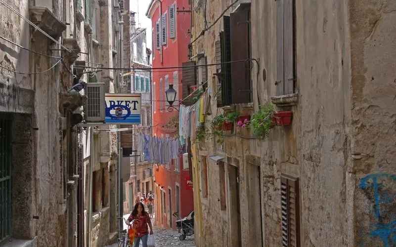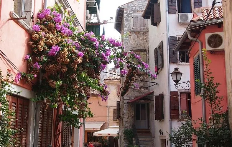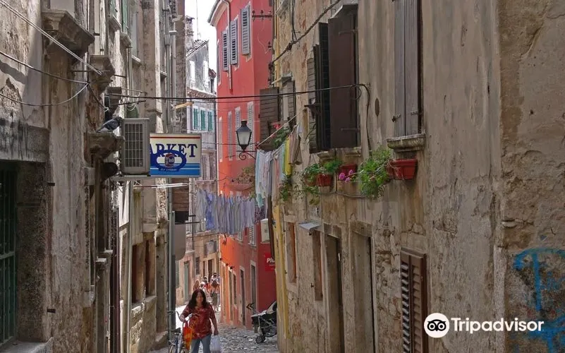 則評價羅維尼精華的部分是坐落在半島上老城區。老城曾有七座門,如今還保留了三座,保存較完好的一座巴洛克拱門上有着威尼斯的標記:踩着聖經、長着翅膀的獅子。老城裡縱橫交錯的老巷子是一大特色,巷子兩邊都是現在仍有人住的老樓房,形態各異,安靜、神祕卻仍顯着有人氣。這一點有點像威尼斯幽深的巷子,所不同的是這一切全部建在山上,加之年代久遠,磨的流光錚亮的大理石鋪的坡道,感覺就遠勝威尼斯的巷子了。看着老房子、看着流光的遍地大理石,抬頭在樓隙中見到藍天,猶如井下見到天一般,偶爾一縷陽光在樓隙間射進來,整個巷子就燦爛了。