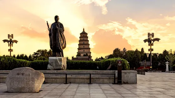 大唐不夜城以大雁塔為依託,北起玄奘廣場、南至唐城牆遺址公園、東起慈恩東路、西至慈恩西路,貫穿玄奘廣場、貞觀文化廣場、開元慶典廣場三個主題廣場,擁有六個仿唐街區和西安音樂廳、西安大劇院、曲江電影城、陝西藝術家展廊四大文化建築。大唐不夜城晚上燈火璀璨,光影中的仿古建築流光溢彩,氣勢恢宏,宛如大唐盛世再現。