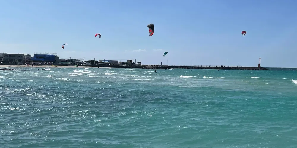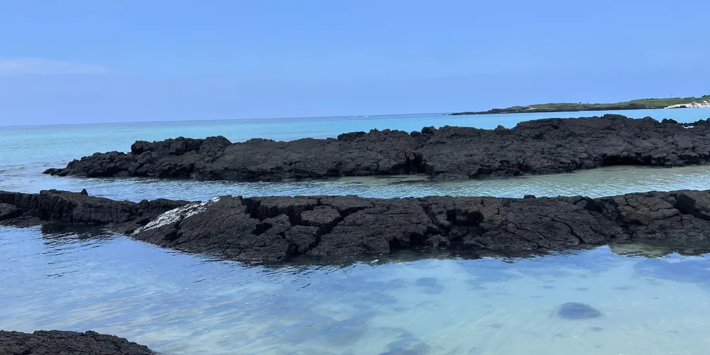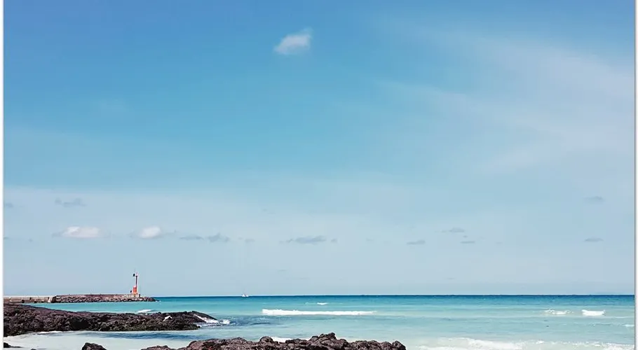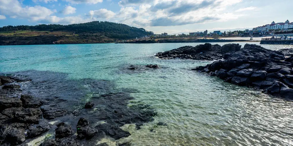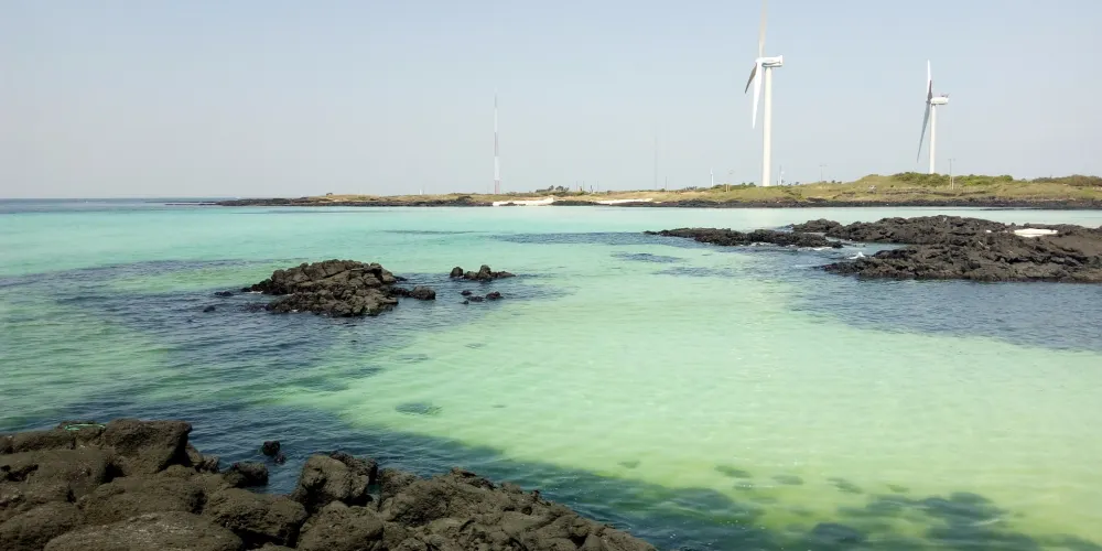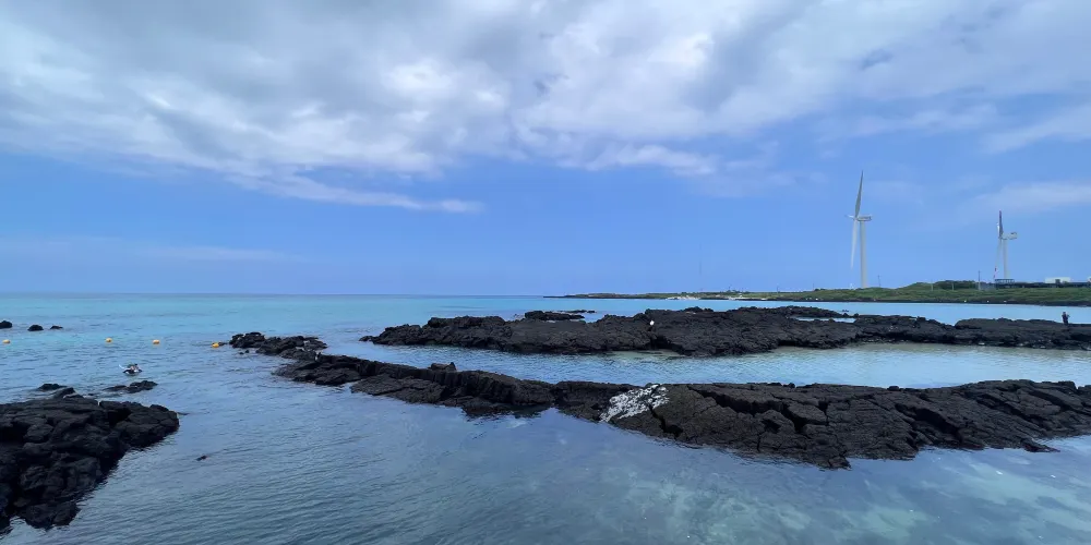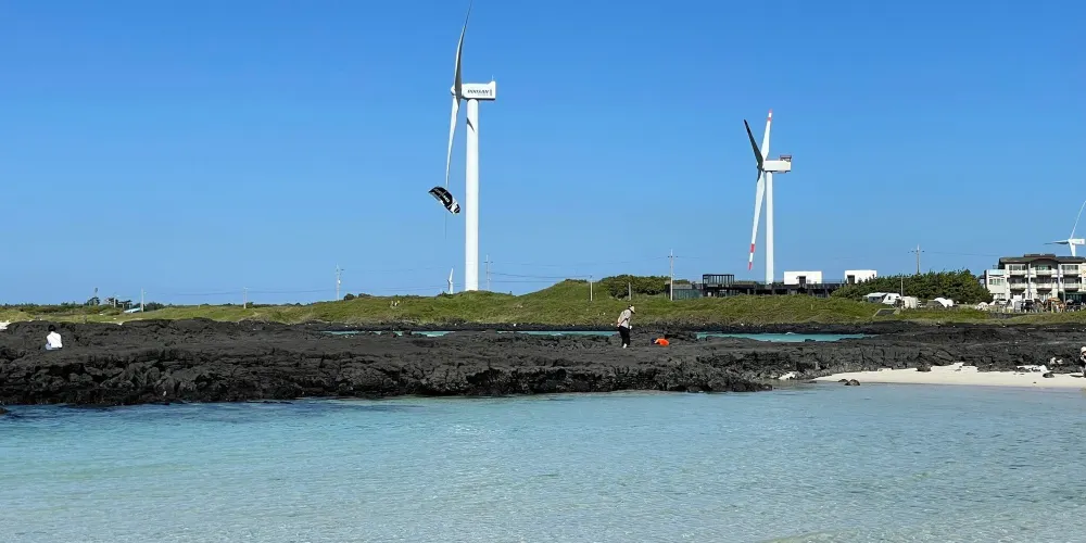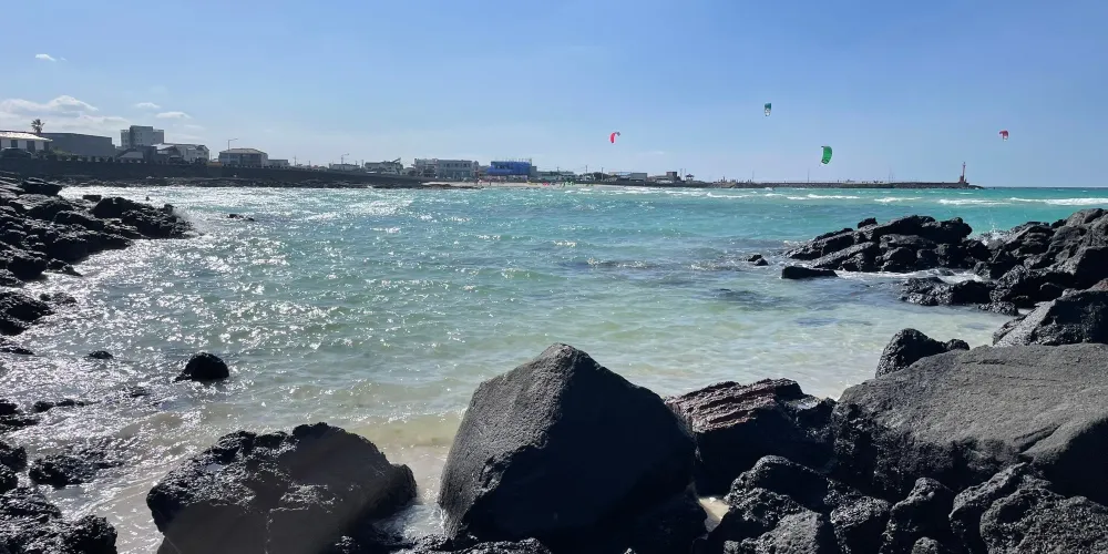 金寧海灘的白色沙灘和黑色熔岩形成鮮明的對比。海灘西邊是一個小港口和金寧帆船俱樂部,在港口附近有風力渦輪機在呼呼旋轉。這是濟州當地人最喜歡的海灘。