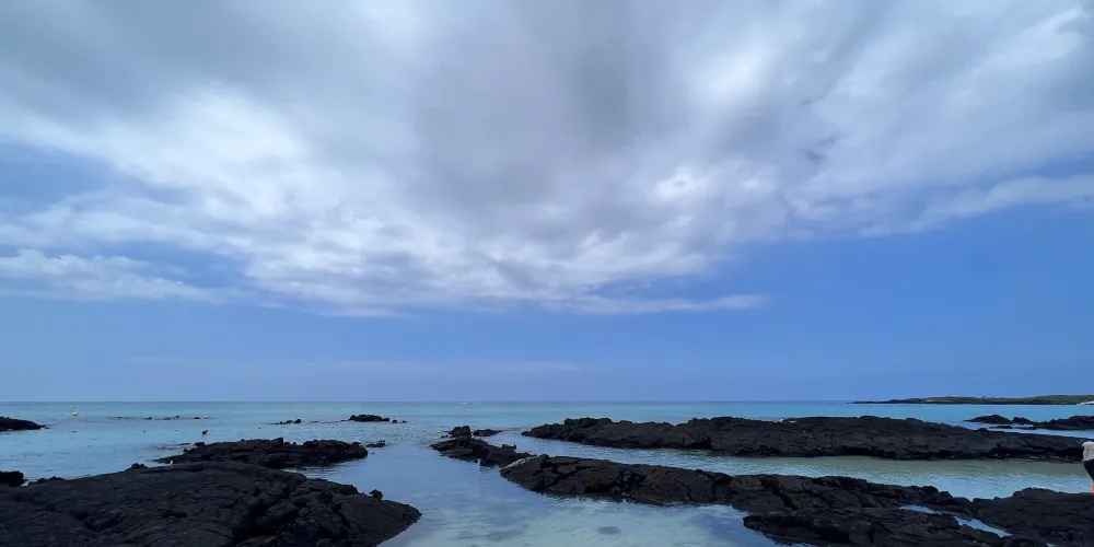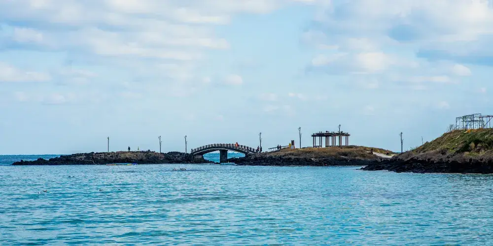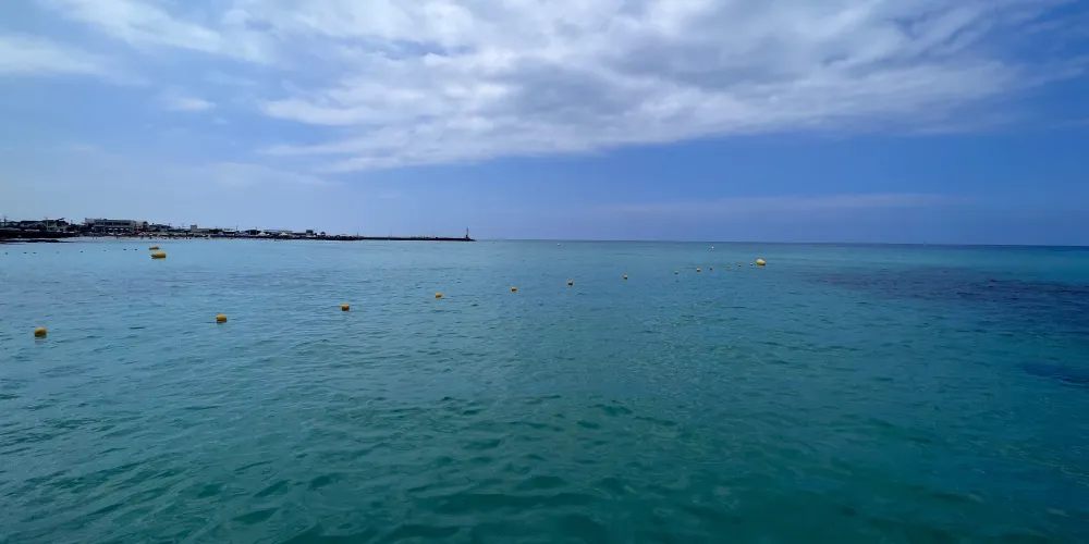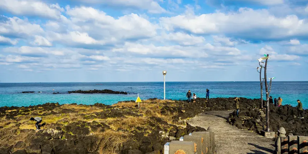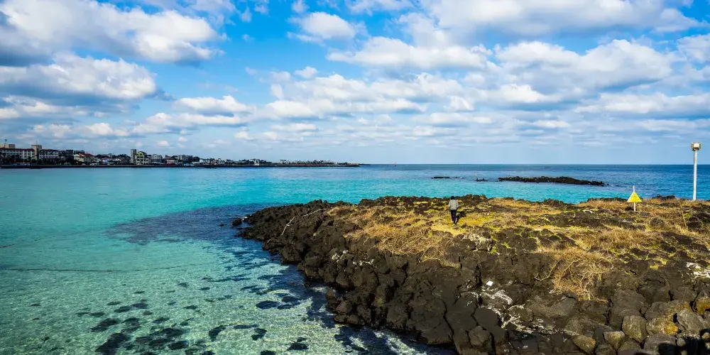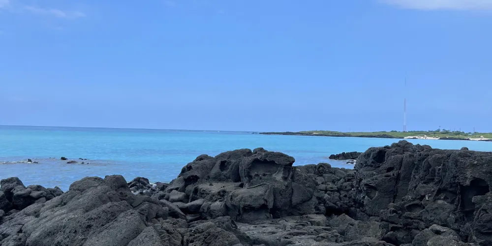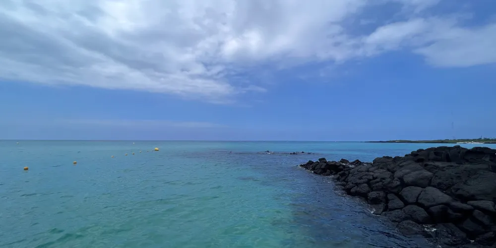 金寧海灘的白色沙灘和黑色熔岩形成鮮明的對比。海灘西邊是一個小港口和金寧帆船俱樂部,在港口附近有風力渦輪機在呼呼旋轉。這是濟州當地人最喜歡的海灘。