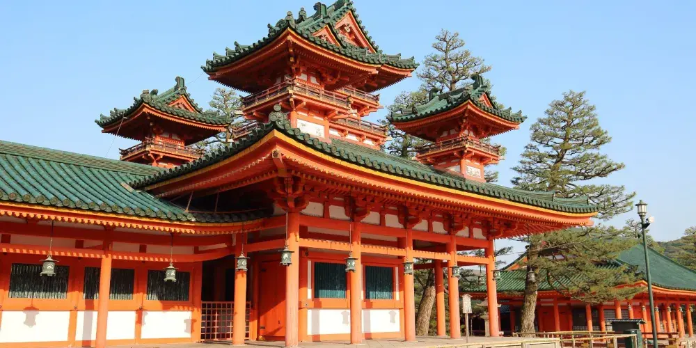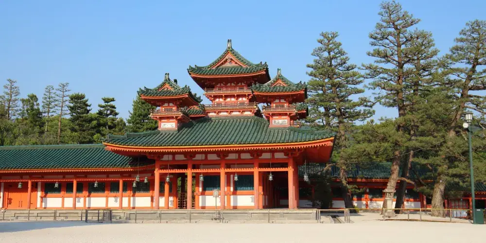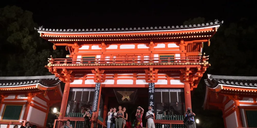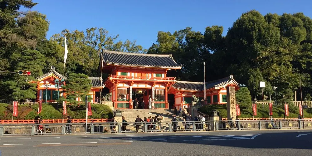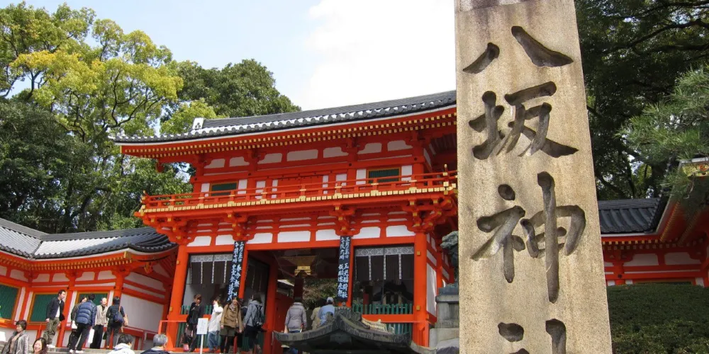 八坂神社位於東山風景區內,是日本全國約三千座八坂神社之總本社,愛稱是祇園さん。神社內有一座相當獨特的美御前神社,可以向掌管美貌的神祈福。神社的例行祭祀活動叫袛園祭,與東京的神田祭,大阪的天神祭並稱為日本的三大祭。春天,這裡也會舉辦夜櫻會。