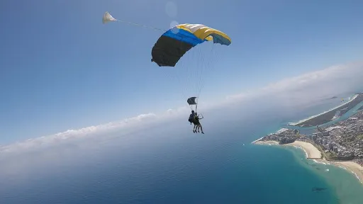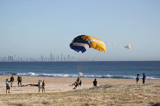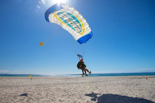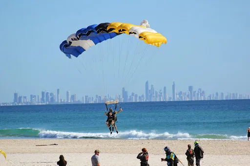 在黃金海岸跳傘可以從空中看到沿海連綿的沙灘和深藍的海面,最後降落在Kirra Beach的美麗海灘上。Gold Coast Skydive是黃金海岸提供跳傘服務的地方。