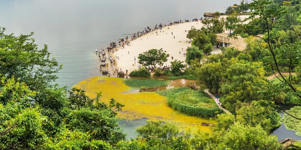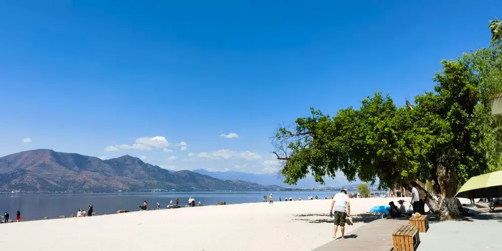 金沙灘也叫金鱗沙灘,是孩子們的遊玩天堂。我在北方的寒夜裡四季如春,你在西昌的金沙灘曬得黝黑。在西昌的兩個地方容易曬黑,一個是小漁村,一個就是金沙灘。金沙灘的太陽大。還沒出正月,孩子就會穿着游泳衣下水嬉戲,還有光腳卷着褲腳在海邊捉小魚小蝦。金沙灘的水沿邛海比較乾淨,小海螺在淺淺的沙灘上暖暖的烤太陽。