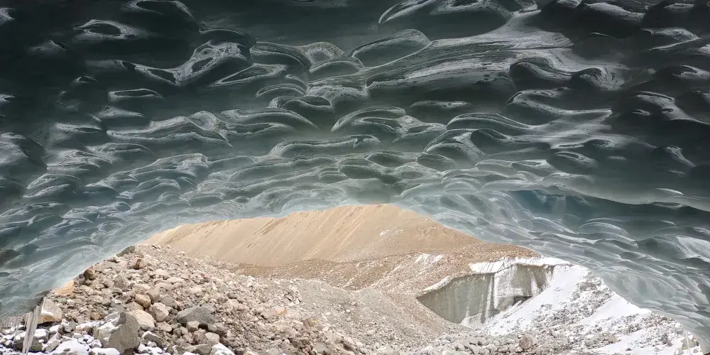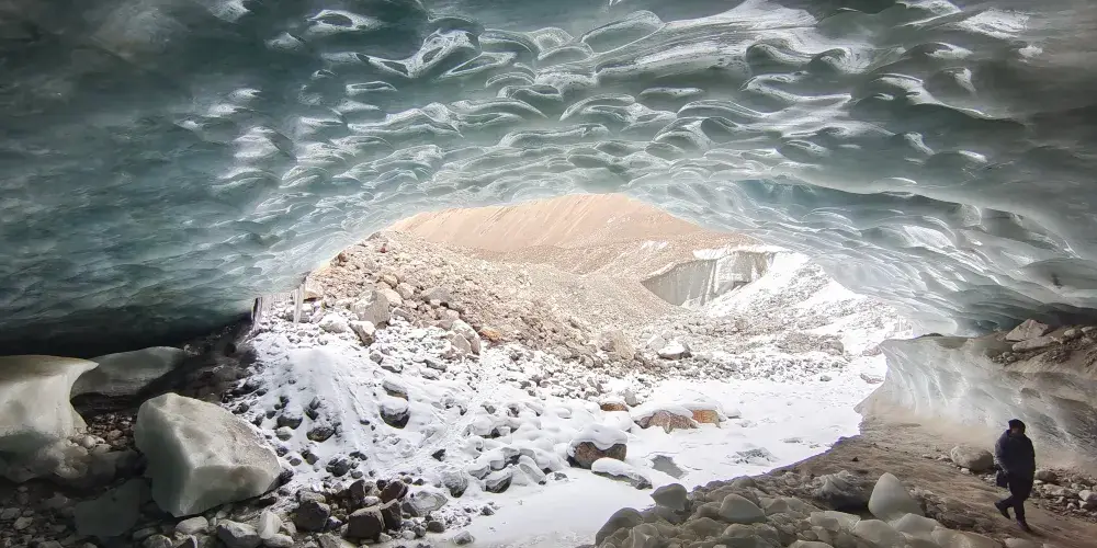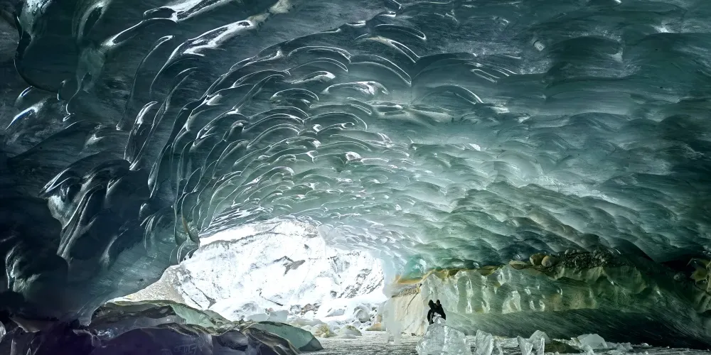 洞口射進的光透入冰層顯幽藍色顯現出冰體中一層層的冰川年層紋理在陽光的照射下猶如水晶宮殿可雙向進入