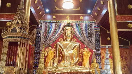佛像制於15世紀,據傳說佛像的頭部嵌有一塊佛祖頭骨舍利,佛像的胸部內有一片刻有巴裡雨的金棕櫚葉,佛像的發跡線和長袍線都鑲滿了貴重的寶石。