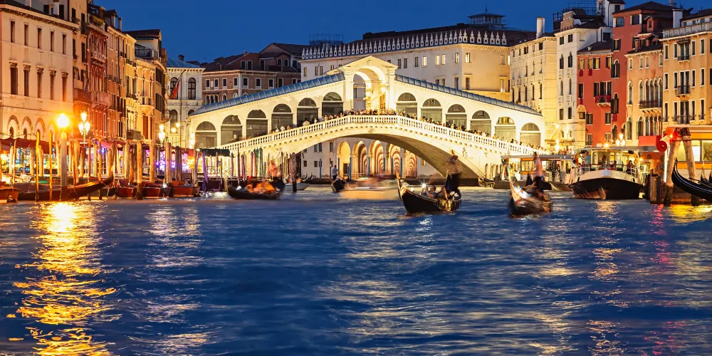 威尼斯大運河是意大利威尼斯市主要水道,沿天然水道自聖馬可教堂(SanMarcoBasilica)至聖基亞拉教堂(SantaChiaraChurch)呈反S型,把該市分為兩部分。大運河呈倒S型,沿岸兩旁100多座古老建築都是12到18世紀威尼斯貴族和富商的府邸。當夜幕降臨,星星點點的燈火開始照亮這座城市,你就像是走進了歷史建築博物館,從拜占庭派和哥特火焰式一直到文藝復興和巴洛克時代的各色建築風格從眼前一一掠過,璀璨的星河與你同行,景色簡直美不勝收。