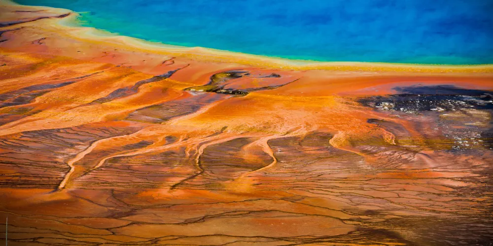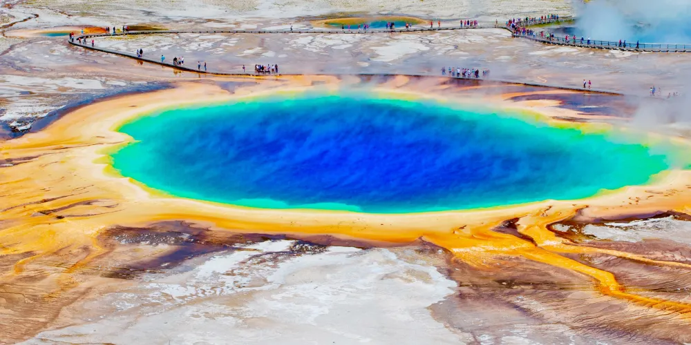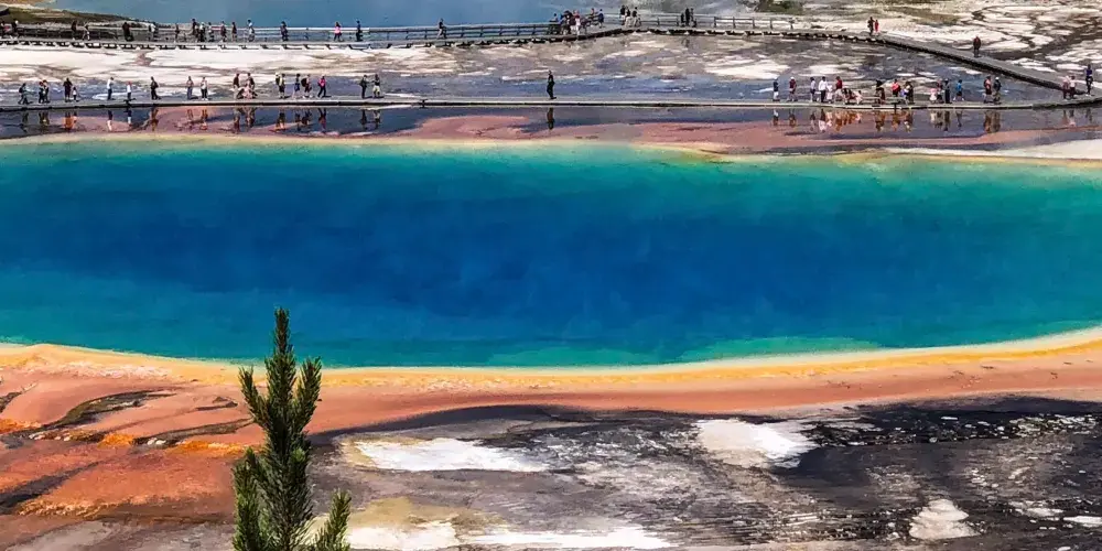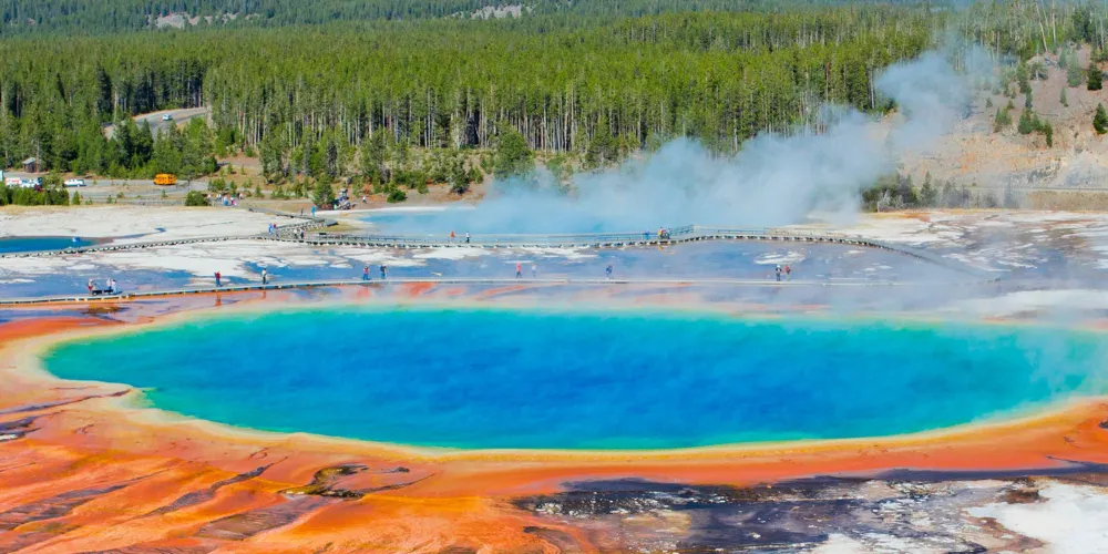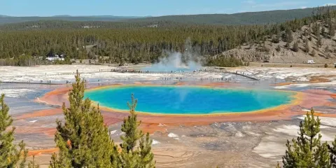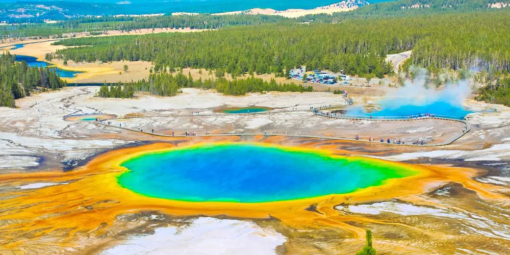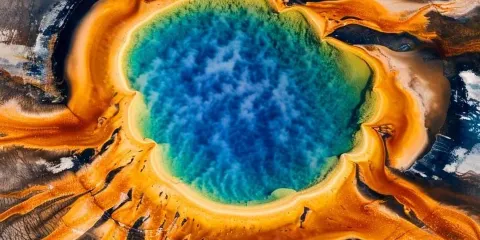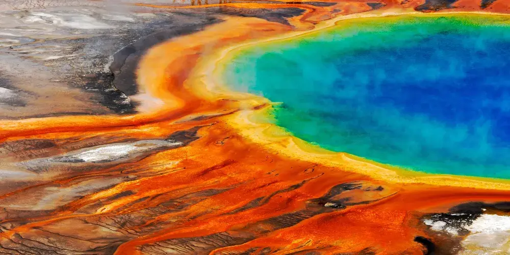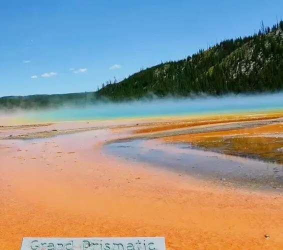 大稜镜温泉,又称大虹彩温泉,位于黄石国家公园。大稜镜温泉的美在于湖面的颜色随季节而改变,春季,湖面从绿色变为灿烂的橙红色,这是由于水体中生活着的藻类和含色素的细菌等微生物,它们体内的叶绿素和类胡萝卜素的比例会随季节变换而改变,于是水体就会出现不同的色彩。在夏季,叶绿素含量相对较低,显现橙色、红色,或黄色。到了冬季,由于缺乏光照,湖内水体就会呈现深绿色。