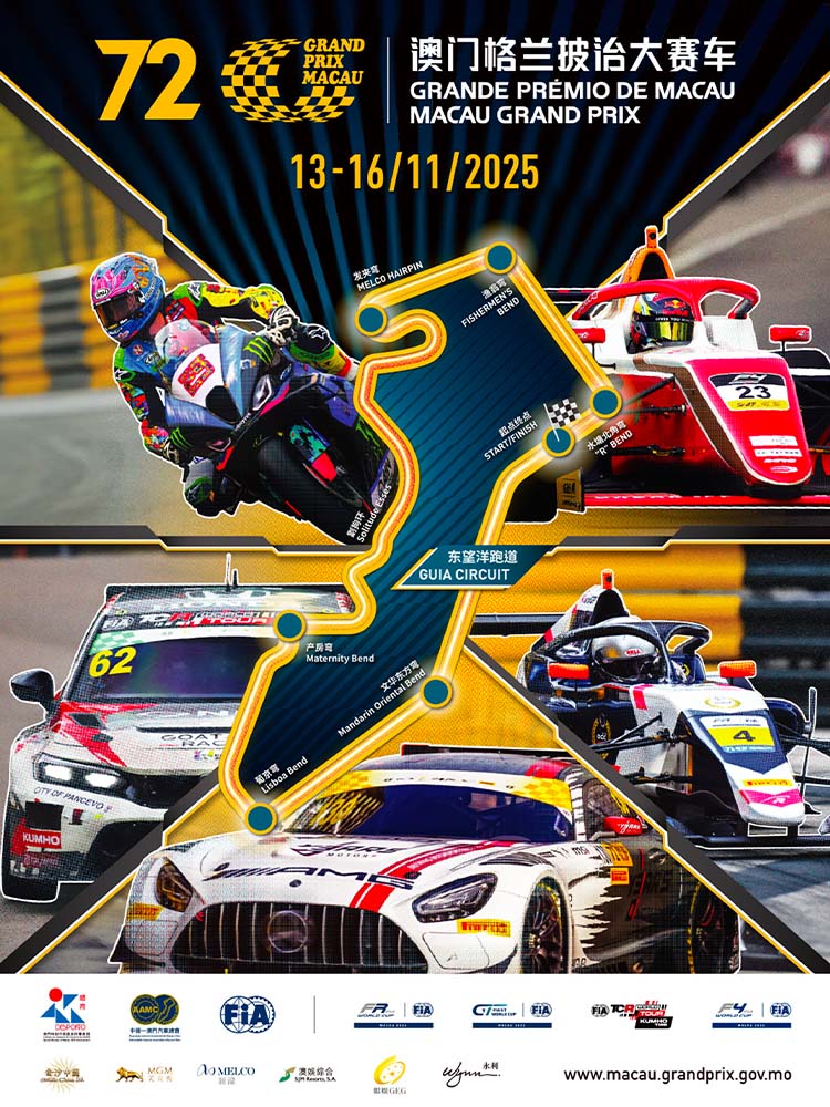 第72屆澳門格蘭披治大賽車將於11月13日至16日舉行。本屆大賽車將舉行七項精彩賽事,分別是:澳門格蘭披治大賽–國際汽聯FR世界盃、澳門GT盃–國際汽聯GT世界盃、澳門東望洋大賽–Kumho國際汽聯 TCR世界巡迴賽澳門站、澳門四級方程式大賽–國際汽聯四級方程式世界盃、澳門格蘭披治電單車–第五十七屆大賽、大灣區GT盃(GT4)及澳門路車挑戰賽。