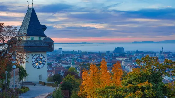 登城堡山眺望老城區風光是到格拉茨遊覽的必須項目。秋天夕陽的餘暉給城堡山更是增添了一份美麗。