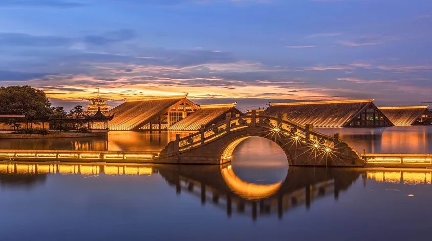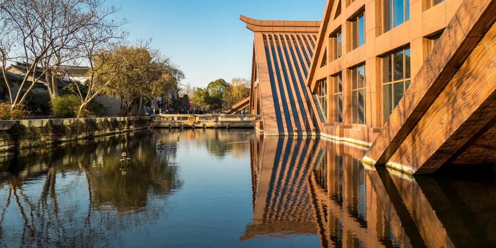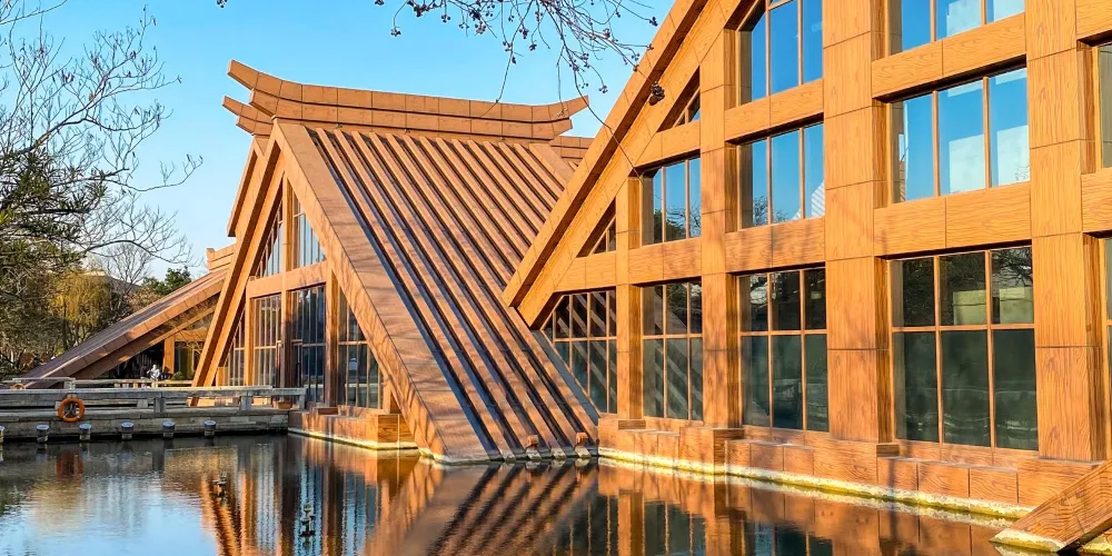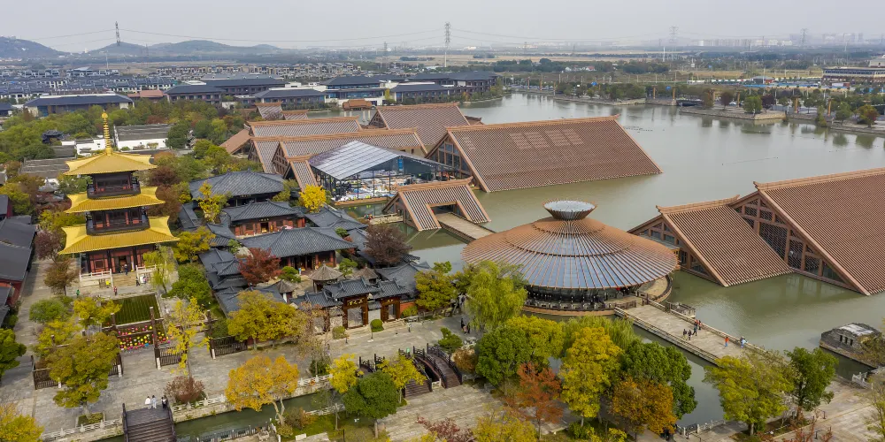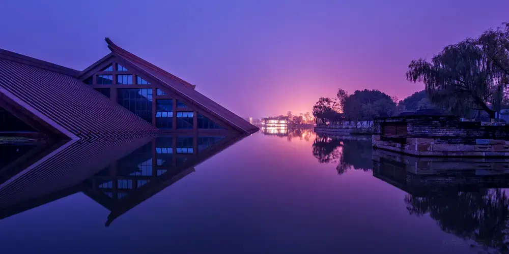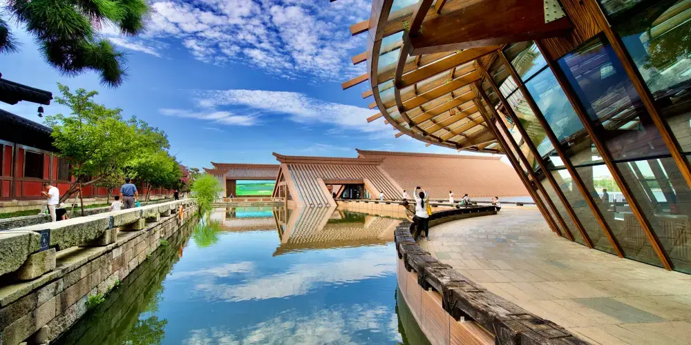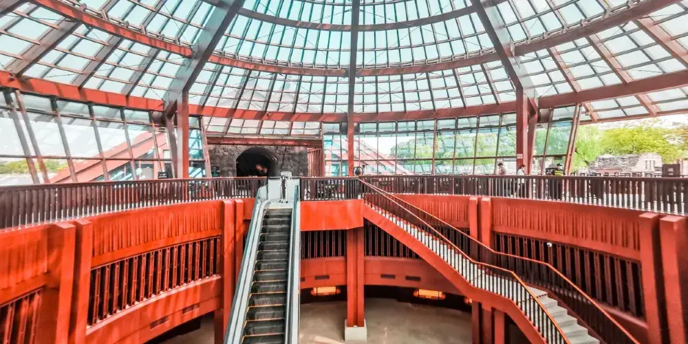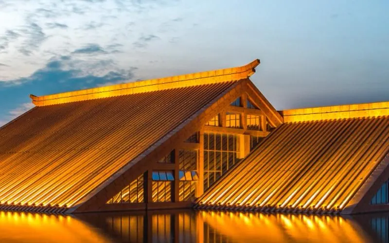 走進遺址,令人流連忘返的就是廣富林文化展示館。整個展覽空間設定在水下,一座座彷彿金字塔般的屋頂漂浮在富林湖中,與周圍環境融合,勾勒出美麗的畫卷。展廳以“時空之旅”為理念,結合現代視聽技術,設計廣富林考古記憶、上海成陸演變、先民活動到來、城邑特徵形成、松江縣府興盛、上海城市崛起、走向未來明天等場景,讓遊客在時光隧道中體驗和閲讀上海這座城市的文明歷史。