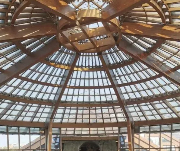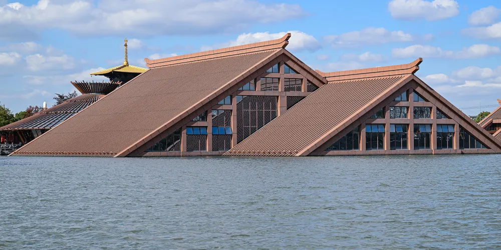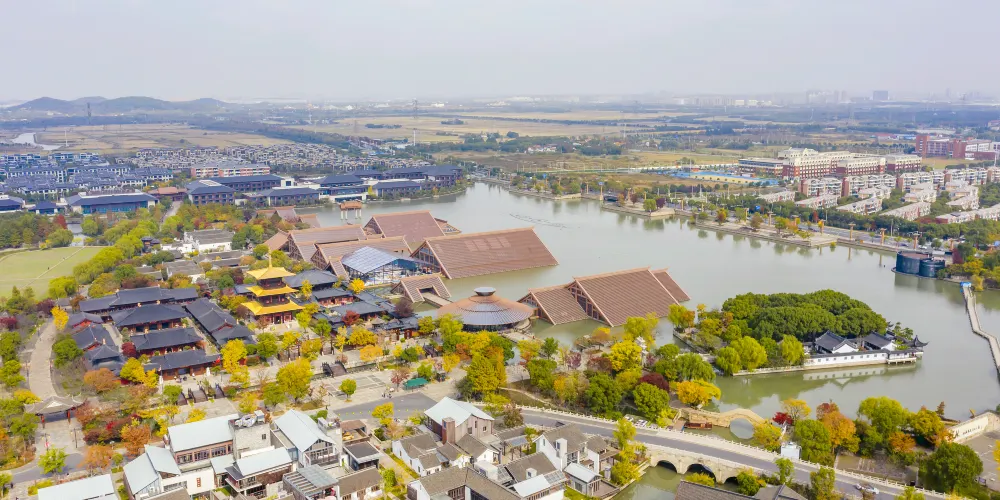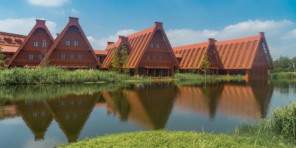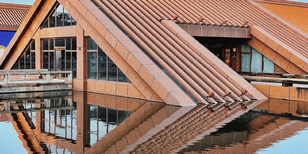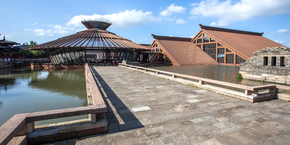 走進遺址,令人流連忘返的就是廣富林文化展示館。整個展覽空間設定在水下,一座座彷彿金字塔般的屋頂漂浮在富林湖中,與周圍環境融合,勾勒出美麗的畫卷。展廳以“時空之旅”為理念,結合現代視聽技術,設計廣富林考古記憶、上海成陸演變、先民活動到來、城邑特徵形成、松江縣府興盛、上海城市崛起、走向未來明天等場景,讓遊客在時光隧道中體驗和閲讀上海這座城市的文明歷史。