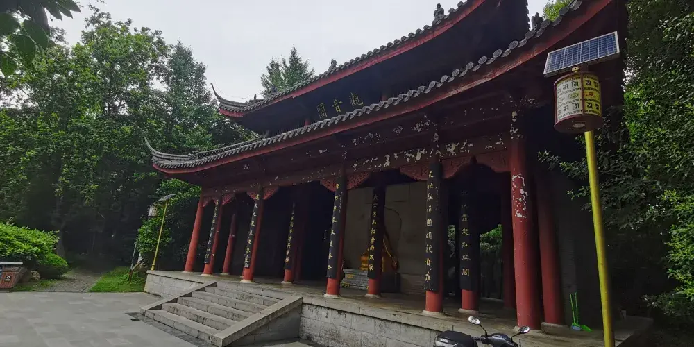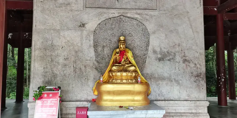 到達景區頂需要爬長長的台階,每過一段台階會有一塊平台以便歇腳。這裡有一個設計上的視覺手法,使你自下而上看時,只見台階不見平台,自上而下看時,只見平台不見台階,你不妨留心一觀。在第五個平台上有兩個大鼎,其中一個鼎壁上還留有日軍侵華時造成的炮彈孔。