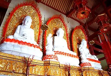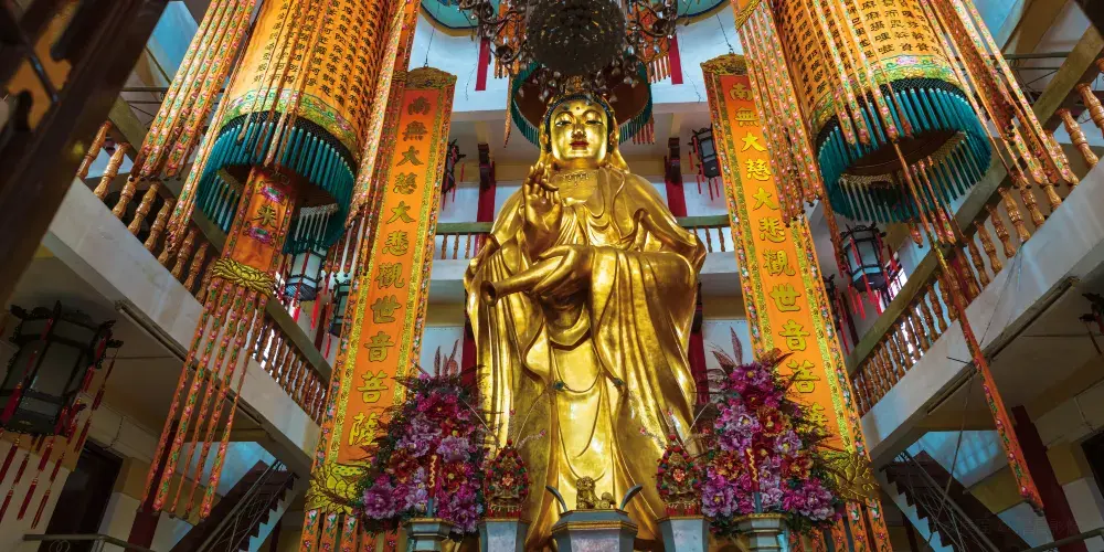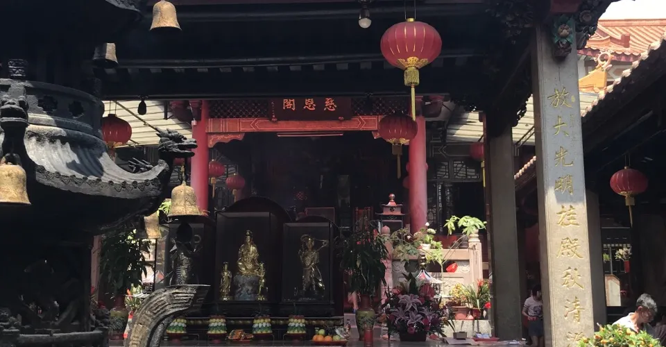 高閣塑10米多高的觀音大士聖像,兩廊塑觀音十八化身。高閣定名慈恩閣,中國佛教協會會長趙樸初題寫閣名,修複後的古大士庵,比往昔更加軒昂寬敞,更顯雄偉壯觀。