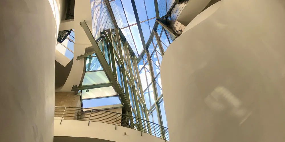 博物館入口處的中庭,被設計師蓋裡稱為“將帽子扔向空中的一聲歡呼”,層疊起伏的曲面創造出打破一切秩序的衝擊力,流動的光影令人目眩。