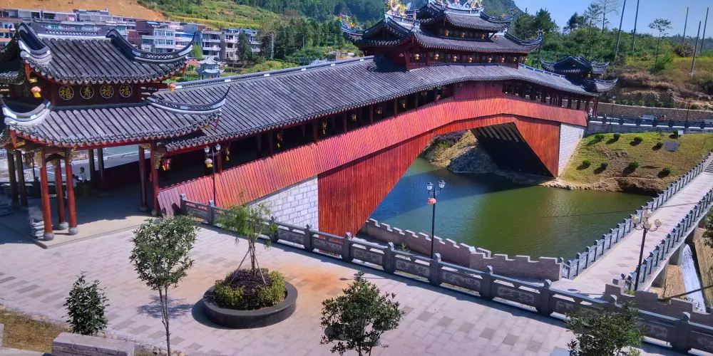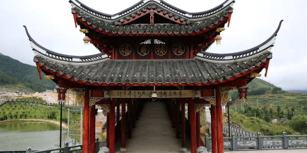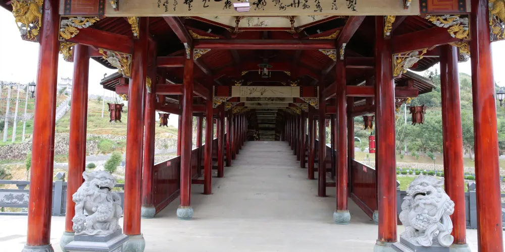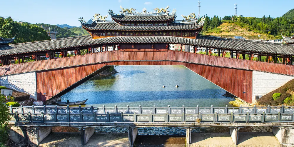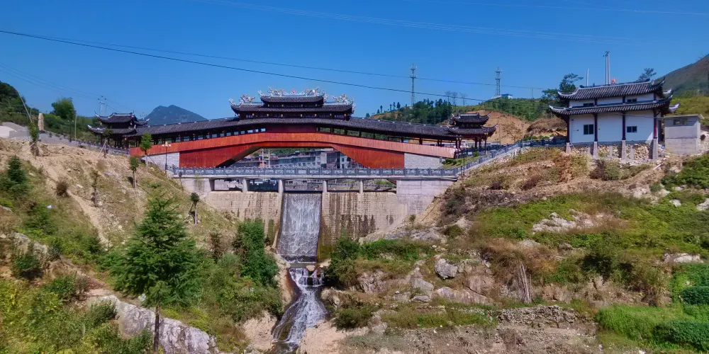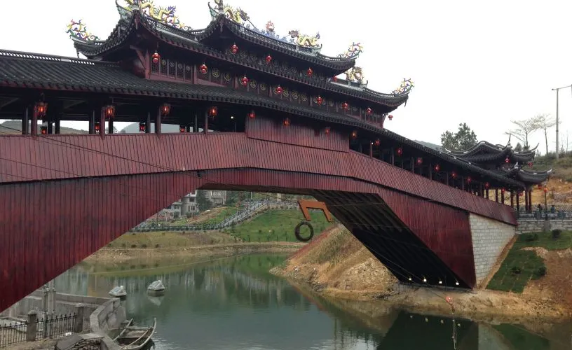 龜湖廊橋是全國單孔跨度較大的廊橋,廊橋的建設完全採用傳統的木拱橋營造技藝,單孔跨度達到40.3米,木料重量範圍為500斤至6000斤,由當地村民集資800多萬元建成。龜湖廊橋吸取了我國傳統的園林風格色彩,無論是屋檐瓦背還是橋身都呈現出了一種厚重的感覺。