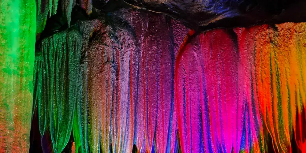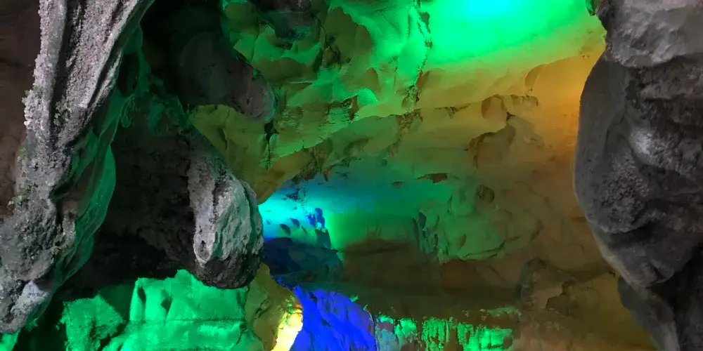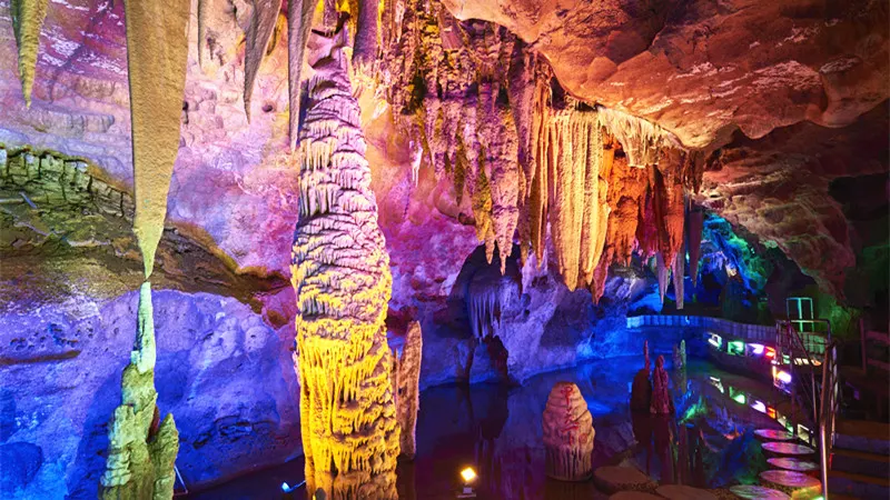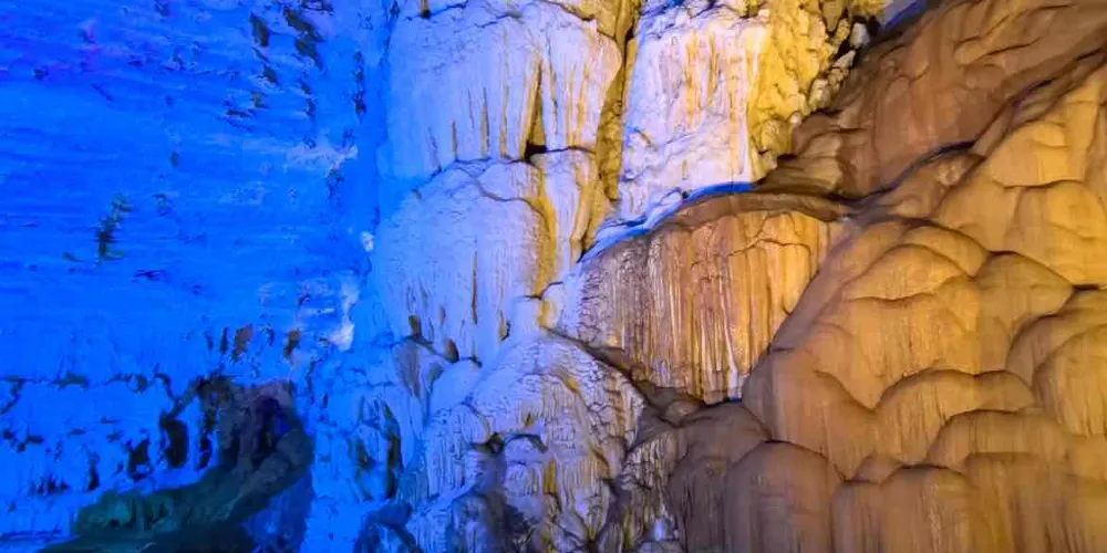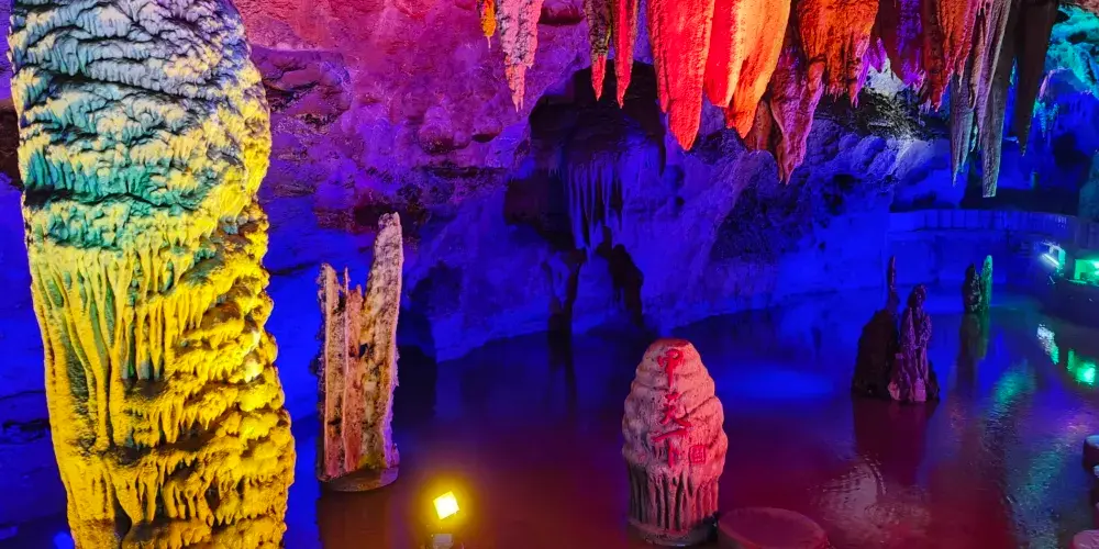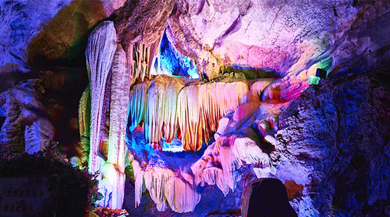 接下來便是景區的主打項目穿山岩溶洞,這裡的溶洞也是典型的喀斯特地貌,雖說沒有七星岩那麼出名,但規模也不小。遊覽岩洞需一路步行,依舊是“三分形象,七分想象”,景區在一些景觀前放置了諸如“麻姑獻桃”、“仙人指路”之類的燈箱,幫助遊人想象。遊覽中留意一處名為“四體石盾”的景觀,它是穿山景區中第二處創下吉尼斯紀錄的景觀,這次是“世界溶洞中單柱鐘乳石上連體石盾數量之最”。