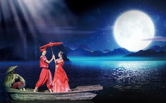大型歌舞《桂林千古情》濃縮了桂林萬年的曆史與民俗,是桂林文化的靈魂。演出分為《桂林傳說》《千古靈渠》《灕江戀歌》 《尋找劉三姐》等幕。演出運用先進的聲、光、電、全息等高科技手段和舞台機械,數百位演員傾情演繹,在水陸空三維立體空間,唱響了一曲感天動地的桂林千古傳奇。一場《桂林傳說》江作青羅帶,山如碧玉簪,桂林自古享有“山水甲天下”的美譽。在這片鐘靈毓秀的八桂大地上,亙古流傳著這樣一個美麗的傳說。桂林的美景引來了邪惡的黑龍,導致生靈塗炭,瘴氣橫行。伏波將軍和疊彩仙子從天而降,拯救黎民。為保此地昌盛祥和,他們化作了山川河流,生生世世守護著這方水土。第二場《千古靈渠》北有長城,南有靈渠。秦軍曆經千難萬險,終於開鑿出了靈渠,實現了七分入湘三分入漓的偉大壯舉,溝通了湘江、珠江和灕江的交通,將先進的中原文化送到整個嶺南,助秦始皇完成了中國歷史上一次大一統的偉業。桂林從此便成為南難通海域、北達中原的重鎮。時至今日,流淌了兩千多年的悠悠灕江水,依然用它甘冽的清流,潤澤著廣袤的嶺南大地。第三場《灕江戀歌》山歌好比春江水,不怕灘險彎又多。一方水土養一方人,桂林這片神奇的土地孕育出許多傳奇人物,劉三姐就是其中家喻戶曉的一位。她是月光下聽風輕吟的百靈鳥,有著出口成歌的本領,她那優美的歌聲遍布山崗,讓鮮花為之綻放、雲霞為之駐留。第四場《尋找劉三姐》滄海桑田,歲月變遷。今天,千千萬萬的海內外遊客來到廣西,來到桂林,來到這盛大的歌圩,尋找心目中的劉三姐。劉三姐在哪裡?是你,是我,是她。我們都是劉三姐,我們都是有情人。