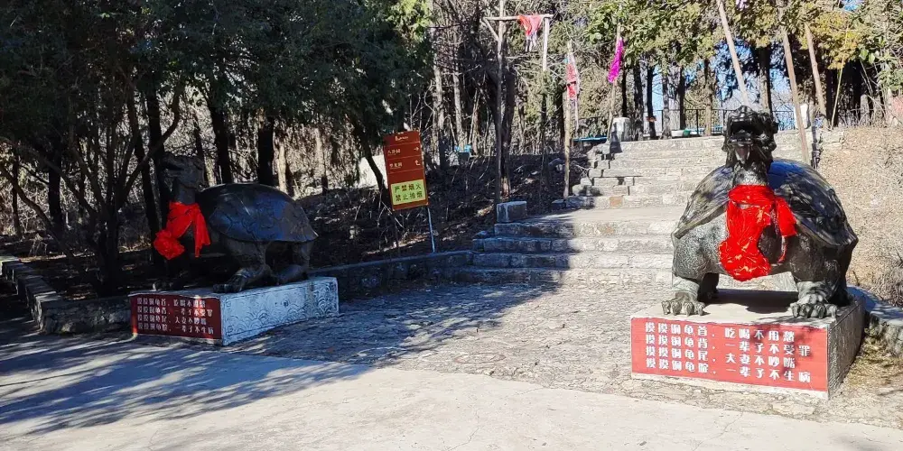 龜山風景區位於棗莊市區東北16公里的孟莊鎮境內,緊瀕境內惟一的中型水庫——周村水庫,北臨抱犢崮森林公園,西、南兩面羣山環抱,含龜山、蛇山、黃山三山,流域面積約6000畝。景區現有景點數十個,較大的有溶洞、觀音堂、山寨、木乃伊古墓、九龍石、老鷹石、八卦園、猴山、水上樂園等。改革開放的春風,使這座塵封多年的歷史名山,以嶄新的姿態,展示在世人面前。龜山,因山體形狀酷似伏卧龜而得名,龜山海拔高度300餘米,山頂周圍懸崖峭壁,密佈歷代綠林豪傑設定的旗桿眼座,惟有南、北兩面可自然上下。龜、蛇二山之間有龜山窩泉,泉水順山澗而下,叮咚作響。山上還有清朝嘉慶年間木乃伊古墓一座及龜山寺遺址一處,山西側山崖有多處自然溶洞,洞內有形態各異的鐘乳、石筍等,山東省地質公園。龜山歷史悠久。從殷朝到明清,先人活動的蹤跡遍佈山頂,鐫刻精細的八卦圖,香煙繚繞的紫雲觀,雄偉壯觀的古山寨依稀可見。山上峯雄石奇,林木茂密,春天花海一片,秋天碩果累累,一年四季鬱鬱鬱葱葱。山下是周村水庫,粼粼波光,葉葉扁舟,美不勝收。山水映照,交相生輝,真是一幅活脱脱的山水畫。魯南第一溶洞更令人連連稱奇。溶洞全長600多米,洞連洞,縱橫交錯。洞內鐘乳石倒掛,石筍林立,滴水叮咚,石壁聳立,既奇妙又壯觀。尤其是鐘乳石和石筍,千姿百態,栩栩如生。