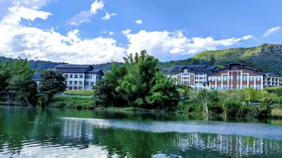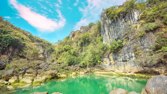銀鏈墜潭瀑布,位於貴州安順黃果樹瀑布下遊,傳說中的“龍犀相摶”的地方——三岔河下面的河咀瀨伏流入口處,屬於落水洞型瀑布。銀鏈墜潭瀑布位於天星橋景區水上石林區的,其形如鬥,其聲如歌,其狀如鏈。在黃果樹瀑布群中,它既不是以高取勝,也不是以闊或大驚人,而是以它那千絲萬縷的情態和如泣如訴的瀑聲,讓人看見就不想離開。