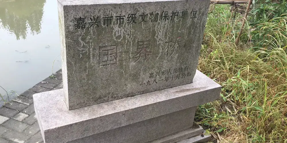 據《左傳》記載,公元前496年,吳越兩國曾在此爭戰,越勝吳敗。宋代有人在此建了一座石板橋,稱國界橋。現橋建於明代,清嘉慶十六年(1811年)重修。國界橋是三孔石柱平板橋,為嘉興市文物保護單位。相傳此處原為吳、越兩國的分界線,故九里港又稱為國界河,河北屬吳國,河南屬越國,以橋為界,故名國界橋。現橋建於明代,清嘉慶十六年(1811)重修。兩邊橋洞內各鑿有石像2樽、高個盈尺。北為吳王夫差,南為越王勾踐。雕做人像,據有關專家考證。雕像可能為明代以前雕刻,國界橋長13.2米.寬1.58米.橋端有清嘉慶年間錠刻的楷書“國界橋”名、兩項刻有活代入所作的兩幅對聯:“肢萊遠溯夫餘譯、端委常存泰伯風”、“星映鬥十臨鵲駕、地連吳越判鴻溝”。