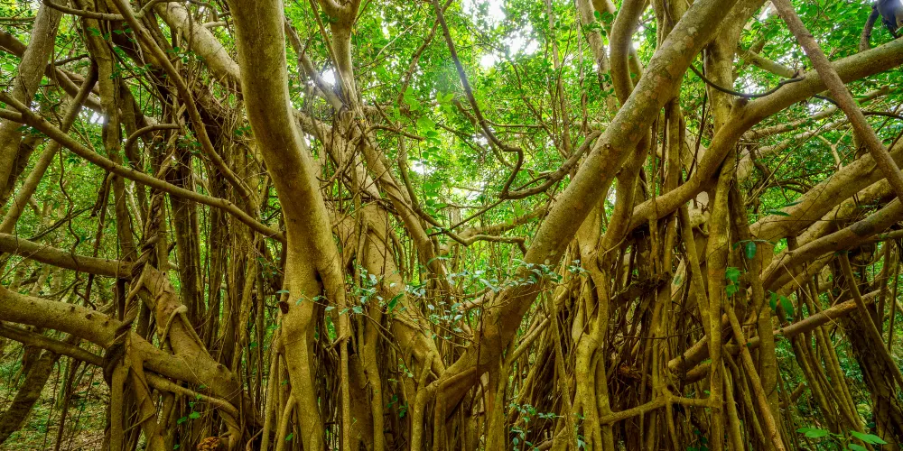 古榕部落的主要景色就是古榕樹。這裏的榕為高山榕,榕樹高大挺拔,樹幹需十三個成人張開雙臂才能合抱。而這一株株榕樹,也許是海風終年吹拂的緣故,榕樹長到一定高度後就橫向生長,長出許多氣根,氣根接觸地面後長成一根根枝幹,這樣的氣根不知多少,數不勝數,遠遠望去,一株榕樹就是一片樹林,在綠茵如水的野芋叢中,構成了“頃地一古榕,飛瀑掛潭中”的佳景,打造了古榕部落“雙龍出海”、“四郎探母”、“六柱擎天”、“八仙會聚”以及榕樹瀑、榕樹牆、榕樹戀、榕樹侶等惟妙惟肖的生態奇觀。