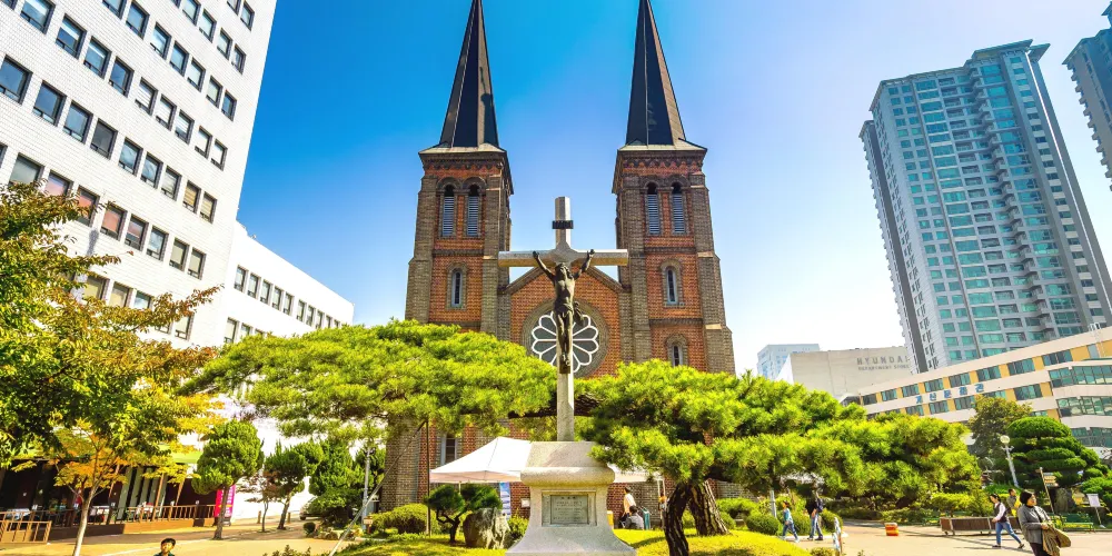 桂山天主教堂位於南山洞,前身建築建於19世紀末,是大邱較早的教堂之一。起初是韓國風格的瓦房,被大火燒毀後,於1902年重建。教堂採用歌德式建築方式,由紅磚、黑磚和花崗岩而建成。教堂的整體佈局以中間帶有碩大拉丁十字的本殿為主,兩邊設有袖廊、輪廓分明。建築的整體風格雖為羅馬式,但在簷塔和彩色玻璃的設計搭配時,加入了哥特式的元素。