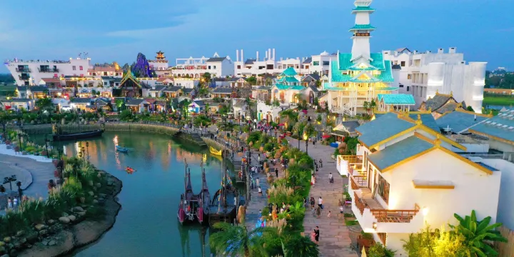 古時候,這裡曾是海邊人民的棲居之地,如今,海絲首港景區將其復刻,一個更加充滿遐想與憧憬的煙火生活之境由此誕生。這裡屋舍儼然,芳草鮮美,有良田美景,也有海港漁船,可見紅瓦黃泥搭建的房屋,高低錯落地分佈在道路兩側,一直延伸至入海灘,如「桃花源」般,呈現出一派安寧和樂,怡然自得的景象。