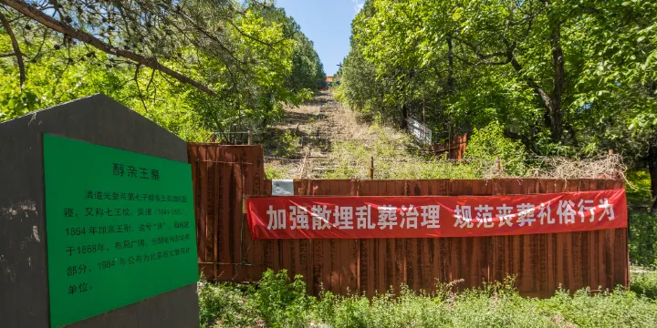 醇親王墓位於北京市海淀區北安河鄉陽台山景區內,是清道光皇帝第七個兒子醇親王奕譞的陵墓,俗稱七王墳。墓建於同治七年(1868年),共有四個寶頂,正中大的為七王奕譞之墳,左右三個比較小的是他的三個妻子的墓。醇親王墓所在的地方在唐朝時就是佛家聖地,“西山八院”之一的香水院,就是這裏。後慈禧和光緒賜銀5萬兩買下了這裏,為醇親王造墓。墓前的山門、碑亭、石拱橋皆在,碑亭西邊有數棵粗壯挺拔的古松。墓地的北邊是醇親王的陽宅,由四個院落組成,院內有祠堂、享殿、過廳、走廊、花園等,佈局幽靜完整。參觀完醇親王的墓之後,站在妙高峯上遠眺,陽台山美景盡收眼底。