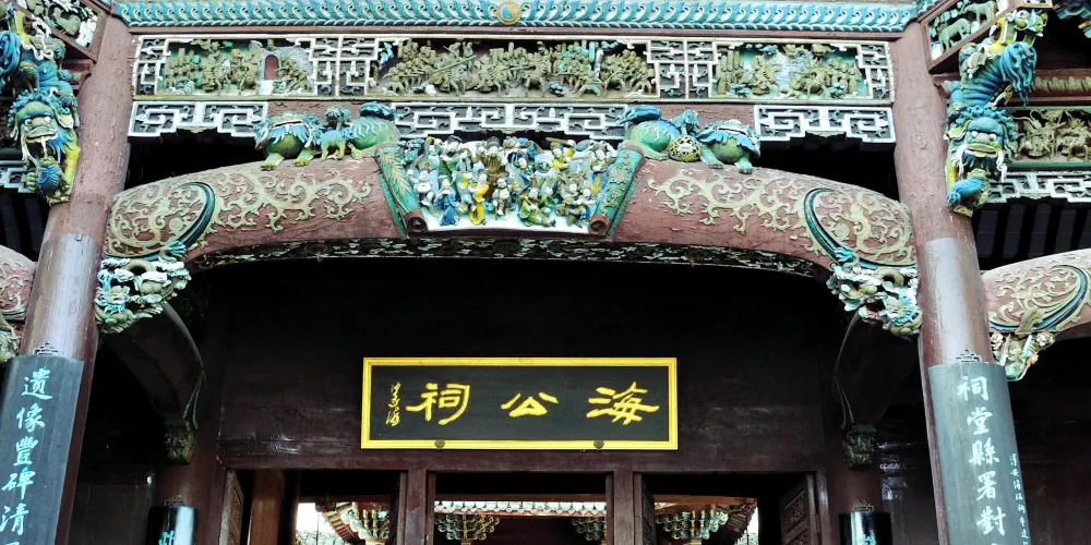 海瑞祠堪稱龍山島的精華所在。遊覽海瑞祠,有四大特色引人注目:一是祠堂建築畫棟雕樑,特別是木雕、磚雕、石雕(合稱“三雕”)精妙絕倫,令人歎為觀止。二是大廳碑廊中的碑刻林立,尤其是海瑞親筆手書“壽字碑”等碑刻,字體飄灑俊逸,內容藴涵豐富,讓人駐足凝思。三是祠堂內的海瑞塑像、兩側的木雕壁畫、廊柱的詩文楹聯無不昭示着海瑞一生剛正不阿、凜然正氣的風範,借古寓今,仍具現實意義。四是庭院中的園林小品,以“高風”、“亮節”為主題,格調通透曠達,佈局錯落有致,花木疏密相間,讓人流連忘返。海瑞祠由望湖台、門樓、正廳、中堂和思賢院五部分組成。整個建築既保留淳安民居風格,又具有徽派建築特色,外觀畫棟雕樑,飛檐翹角。尤其是站在望湖台前,近看海瑞祠的建築風貌,遠眺千島湖鎮的一城山色,令人美不勝收,賞心悦目。