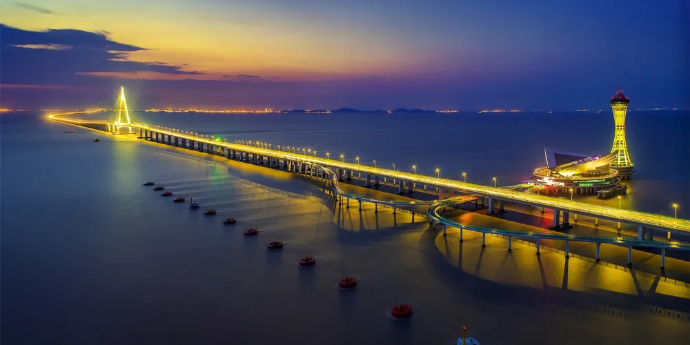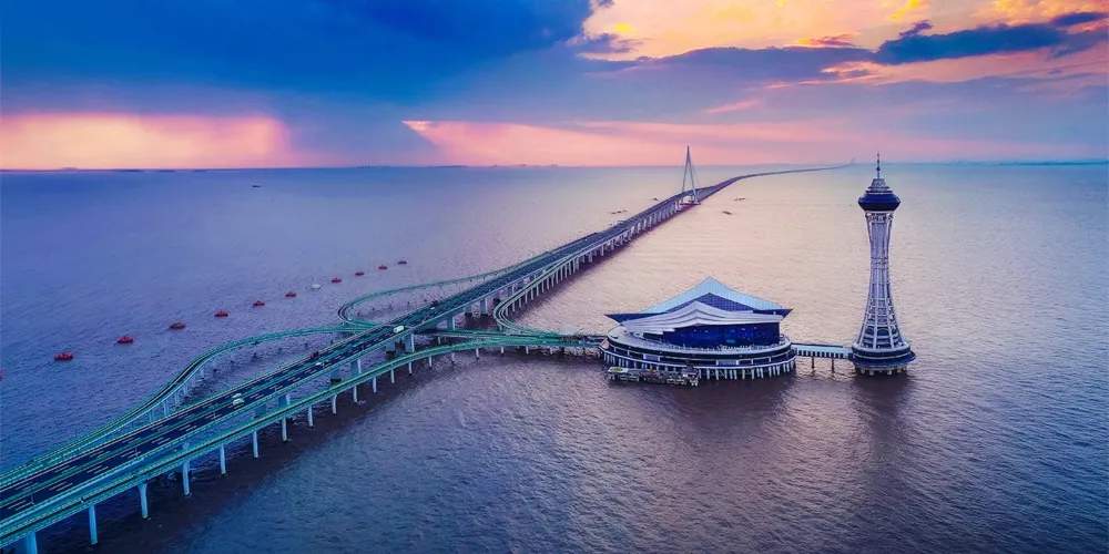 杭州灣跨海大橋北起嘉興市海鹽鄭家埭,止於寧波市慈溪水路灣,全長36公里。它是上海、蘇南地區與寧波北大門的快速通道,週末經由跨海大橋自駕去寧波、舟山吃海鮮,到蘇州賞園林,都非常方便。夜晚燈光亮起更是好看。