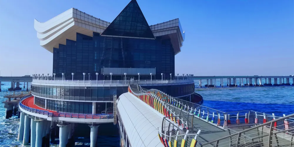 國內海上彩虹玻璃棧橋,連接觀光平台和觀光塔的主要通道,驚險、刺激的同時帶您領略杭州灣大橋和海天一洲的景色。