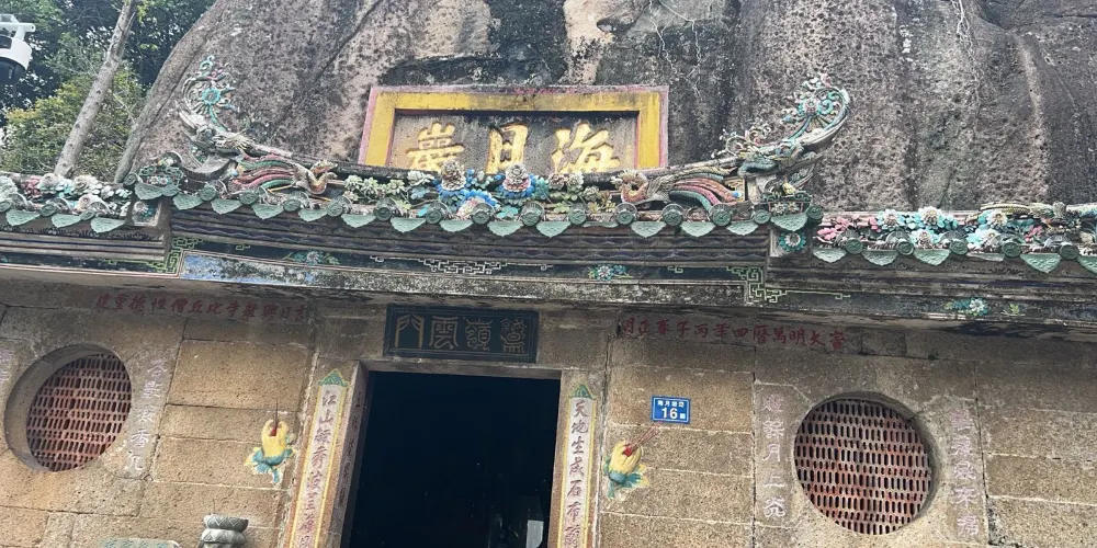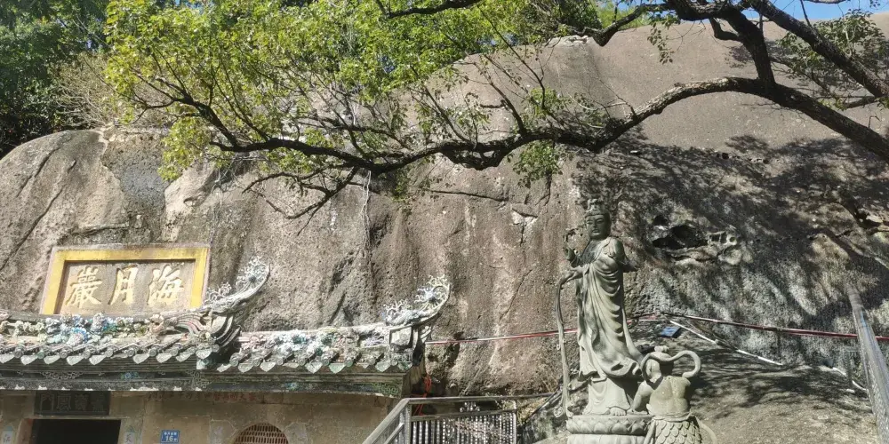 這是一個建於宋代的巖寺,它依天然石洞而建,頂蓋一巨石,石長31米,寬13米。寺內的石壁上有如來佛像,每當旭日初照的時候,陽光照在佛像上,被稱為“日出窺禪”。在中秋之夜(20:30左右),月光經過巖下羊角潭的水反射到佛像胸部,這被稱為“月照禪心”。大雄寶殿有一副對聯描繪了這樣的景象:“海氣凝云云氣結成羅漢相,月光映水水光返照菩提心”。海月巖寺前空曠,從這裏憑欄遠眺,但見海天遼闊、煙波浩渺,景象甚是壯觀。