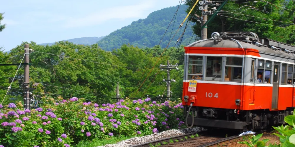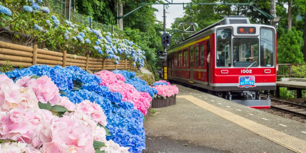 箱根登山電車沿線的繡球花在6月中旬會迎來花期。繡球花盛開時節的箱根登山電車有著「繡球花電車」的暱稱而受到歡迎。箱根登山電車如其名,是攀登箱根山的電車,隨著各處的海拔攀升,繡球花的觀賞時期會逐漸延遲,直至7月下旬。您可以從緩慢行駛的登山電車中欣賞幾乎觸及車窗的沿線盛開的繡球花。