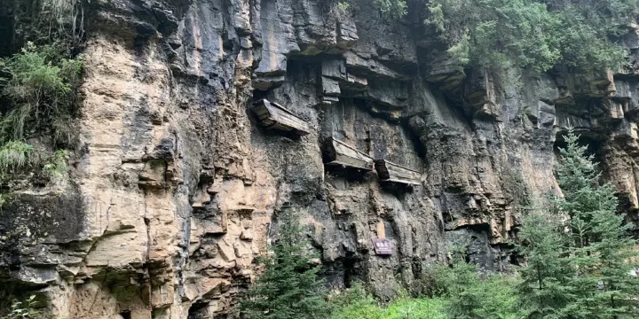雅安碧峰峽裡的一個景點,在高高的懸崖上,三口懸棺清晰可見。