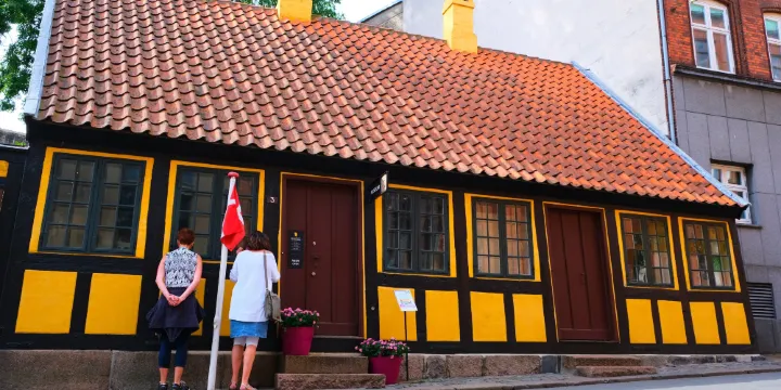 安徒生兒時故居位於丹麥歐登塞市,安徒生與父母住在一起時,在這間小屋度過了2-14歲之間的童年。如果以一位偉大童話作家的故居來衡量,小屋略顯簡陋,但卻是安徒生甜蜜的童年記憶。這片展現安徒生現實生活的水泥足跡被完好地保存著,不經意就讓人回到了安徒生時代。這個鞋匠家庭的小屋只有18平米,向世人展示安徒生與故鄉歐登塞剪不斷的連結。這裡的展出都完整的按照安徒生自傳所描述的那樣,在這裡你可以看到做鞋的工具、重建的安徒生時代的床等等。
