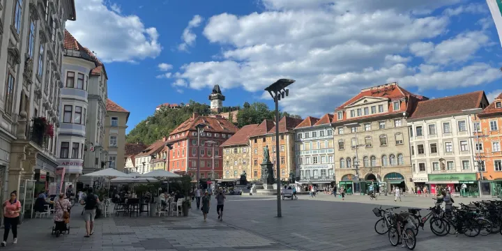中世紀時期,曾是一個重要的商貿集散地,後來成為格拉茨的城市中心。2002年廣場進行了重建,從而成為公眾聚會和遊客集散的場所。夜幕降臨,動人的樂曲伴隨著柔和的燈光飄蕩在廣場各處,美麗的噴泉旁坐滿一對對伴侶,浪漫溫馨的氣氛怎麼能不令人陶醉。