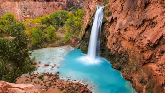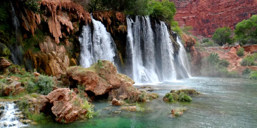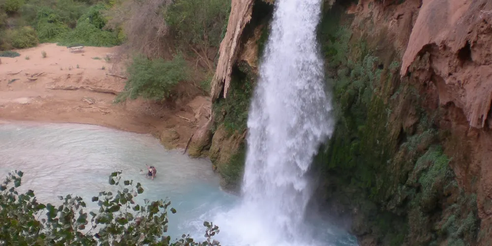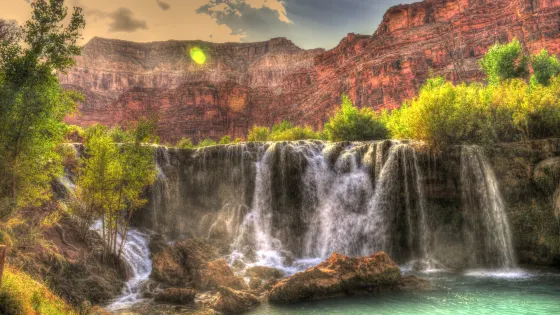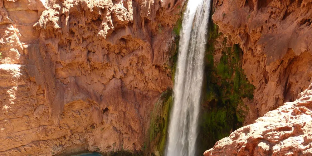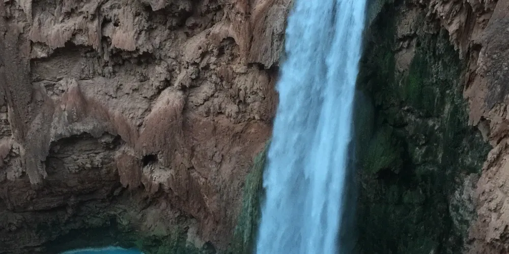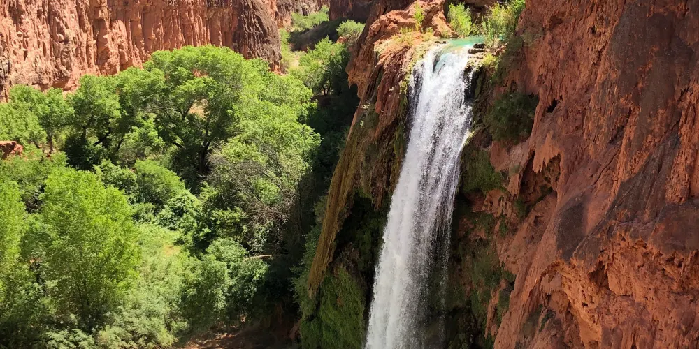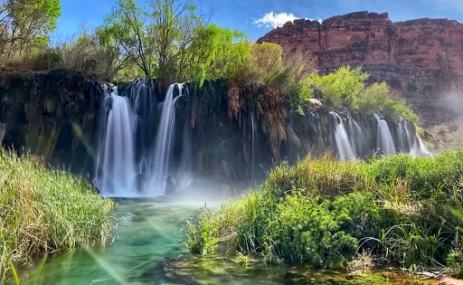 哈瓦蘇瀑布被稱為北美一大瀑布,雖然它30米的落差並非很高,但瀑布以其顏色的絢麗和變化多端而著稱。你會看到瀑布水流呈現藍色,是因為其中含有石灰華物質。藍色的瀑布沿着紅色的巖石傾瀉而下,直落到綠寶石一般的湖中,令人眼花繚亂。瀑布腳下有一塊長滿草的小土丘,從這裏可以仰望哈瓦蘇瀑布,也是別有一番趣味。
