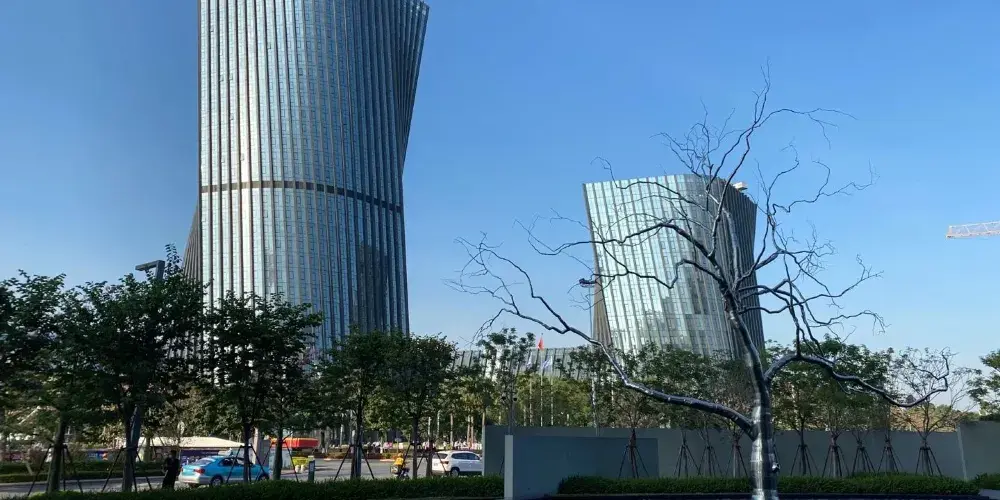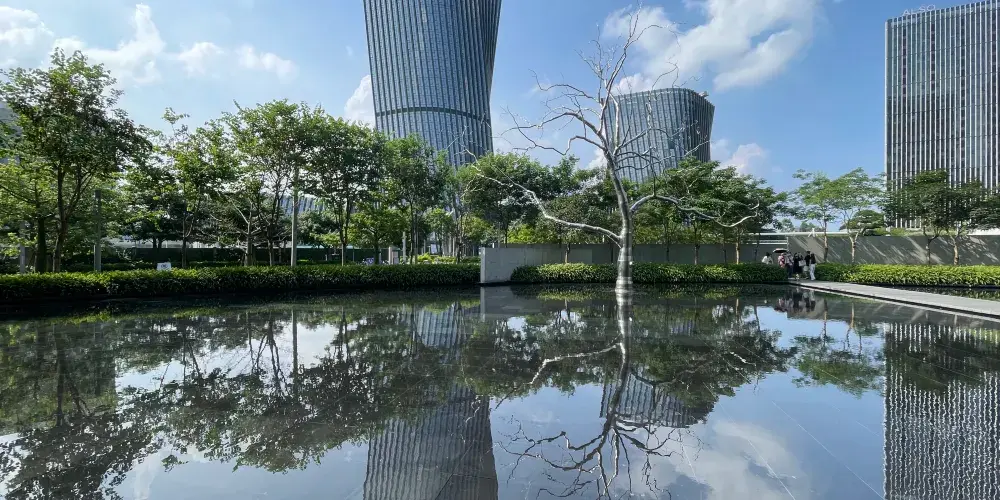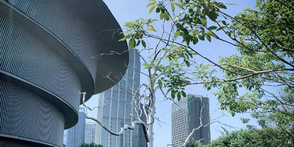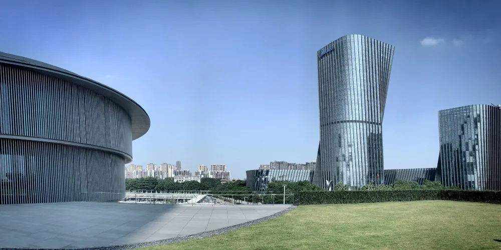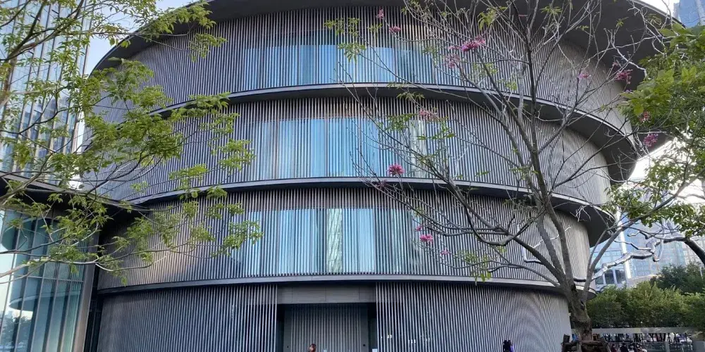 HEM的建築設計把對立的特徵融合起來,形成了由簡單的圓形和方形構成的建築形體。作為中心的圓形,其重心和尺度伴隨着高度發生偏移,產生了由內到外,由建築到城市,緩緩擴散的效果。這是中原古建築“天圓地方”的傳承,也是象徵性純幾何學立體的交錯而創造出具有嶺南建築文化特徵、呈現光影禮讚的建築風景。