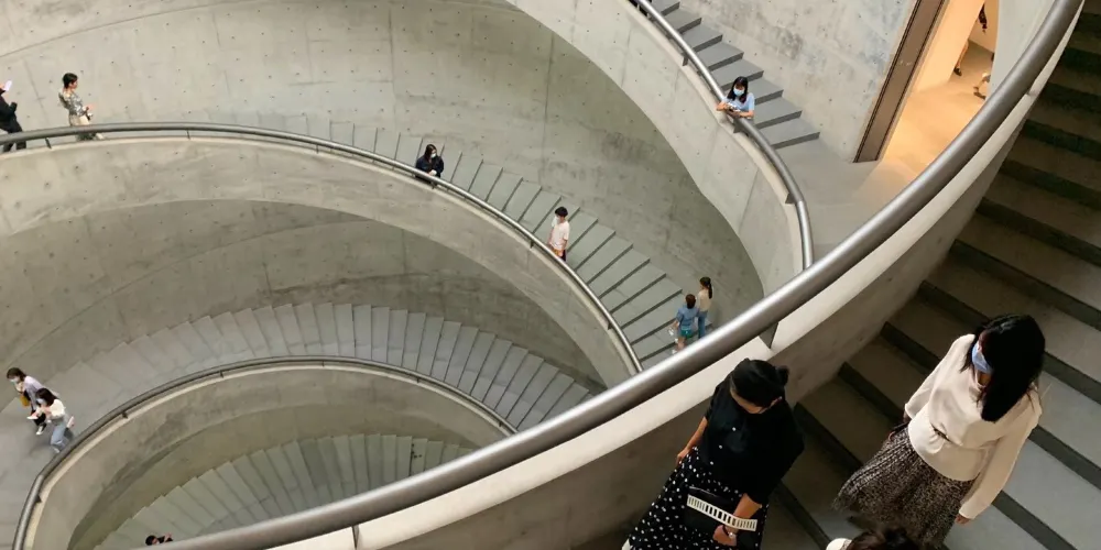 建築從細部到整體構成,甚至包括景觀設計,都如同水面的波紋一樣,層層展開。而中心便是圓筒狀5層挑空的空間。雙重螺旋樓梯盤旋而下,形成中央圓形空間。如同DNA結構的雙螺旋清水混凝土樓梯,是HEM建築一個令人歎為觀止的亮點,同時也見證了中國建築技術的飛躍進步。