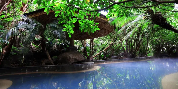 荷花溫泉充分利用得天獨厚的溫泉資源和自然生態田園風光,精心設計,建成集度假休閒、觀光遊覽、展銷購物、餐飲住宿、會務接待、商貿洽談、文化交流為一體的綜合服務區和旅遊景區,為顧客提供各種服務。荷花溫泉享有「溫泉博物館」之美譽,景區內已探明擁有25處天然溫泉出水口,有小蘇打泉(可直飲溫泉)、矽酸泉、硫磺泉、鐵泉、氯化鈉泉、碳酸泉6種泉質。森林溫泉泡池溫度在38℃-45℃之間,森林覆蓋率高達95%,19個特色泡池掩映在原始森林中(19個特色泡池包括玫瑰、牛奶、蘆薈、薰衣草、艾草精油泡池,漩渦池、泡泡池等功能性泡池及原湯池),配套水華茶餐廳、乾蒸房、濕蒸房等。