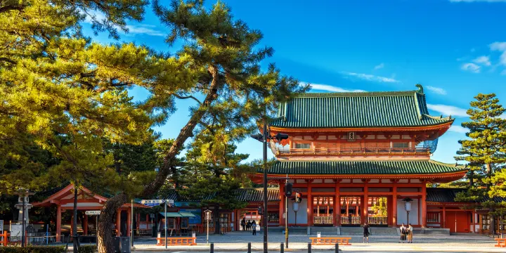 建於公元1895年,是為了紀念平安遷都1100年而建的。該景區模仿平安時代皇宮的部分建築修建,祭奉桓武天皇和孝明天皇。景區分為大鳥居、神宮道、應天門、神苑等景點。正殿裡的神苑是日本池泉回游式庭園的代表傑作。