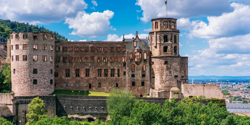 海德堡城堡坐落於國王寶座山頂上,採用紅色沙石建造於13世紀,在1537年和1764年兩次遭受雷擊,並在三十年戰爭和大同盟戰爭中損毀嚴重,逐漸形成今日的格局。古堡的正門雕有披著盔甲的武士隊,中央庭園有噴泉以及四根花崗岩柱,四周是音樂廳、玻璃廳等建築物。堡中還有裝葡萄酒的大酒桶以及大酒窖吸引著觀光客。