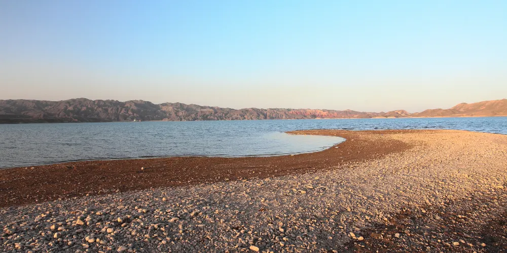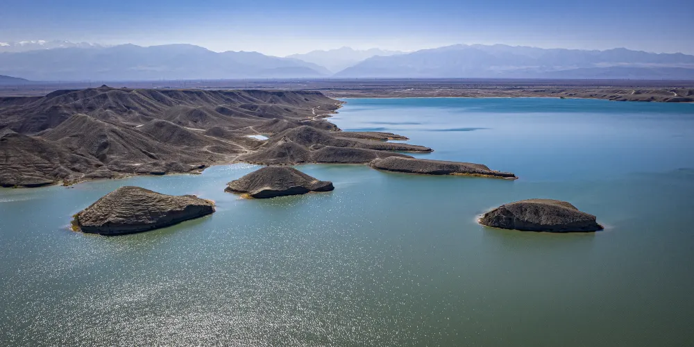 黑山湖是嘉峪關市較大也是較大的人工湖。水質清澈,無任何污染。特別是那一段紅色的丹霞地貌和被湖水分開的一片片的山丘,在日光和湖水的掩映下形成了讓遊客讚歎不已的景色。