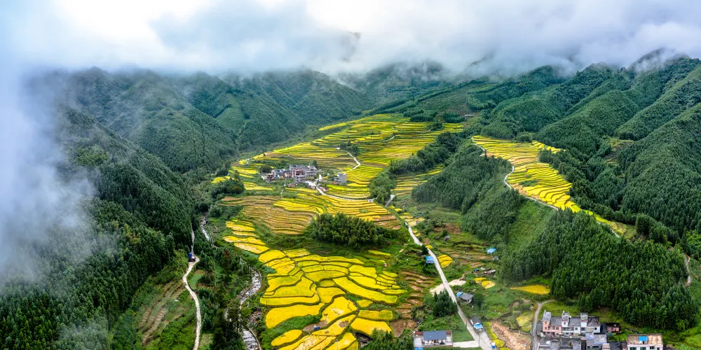 黑山梯田位於黑山村西北部,地處大霧山腳下,山頂常年雲霧繚繞,藏在深山裡,保持着原生態的風景。