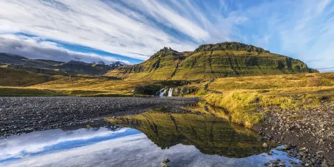 - 4.7分距離市中心6.9公里斯奈山半島上大名鼎鼎的基爾丘山,因外觀神似草帽,又名草帽山,基爾丘山從黃色丘陵間升起,帽頂一圈一圈的岩石輪盤旋上升,大大的帽簷鋪展入湖中,叮咚溪流與騰躍的瀑布環繞其旁,景色異常美麗迷人。這裡是冰島深受歡迎的攝影聖地之一,從任何角度都能拍出讓人讚嘆的照片。這裡還是《權力遊戲》的拍攝地點之一,吸引大量的劇迷前來觀賞。