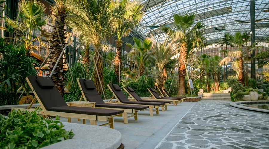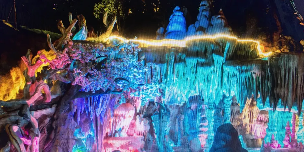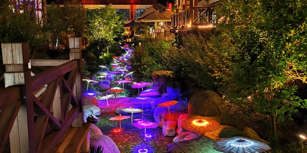 【天池瀑布】 「天池瀑布」以耐寒、長壽的旱柳為主題,坐落於兩山之間,集動靜於一體。眼前這道寬150米、高35米的天池瀑布,是橫店人的匠心之作。弧形水幕懸掛於岩壁,宛如一幅白絹傾瀉而下,「嘩嘩」水聲猶如織布機的宏大合奏,氣勢磅礡,充分展現動態之美。