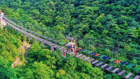 步步驚心網紅橋也位於景區「雲幻之城」高山遊樂區塊。分七彩玻璃橋和原木踏板橋兩條,長度約100公尺。踏上網紅橋,聽山風在耳邊輕唱,看瀑佈在腳下奔騰。