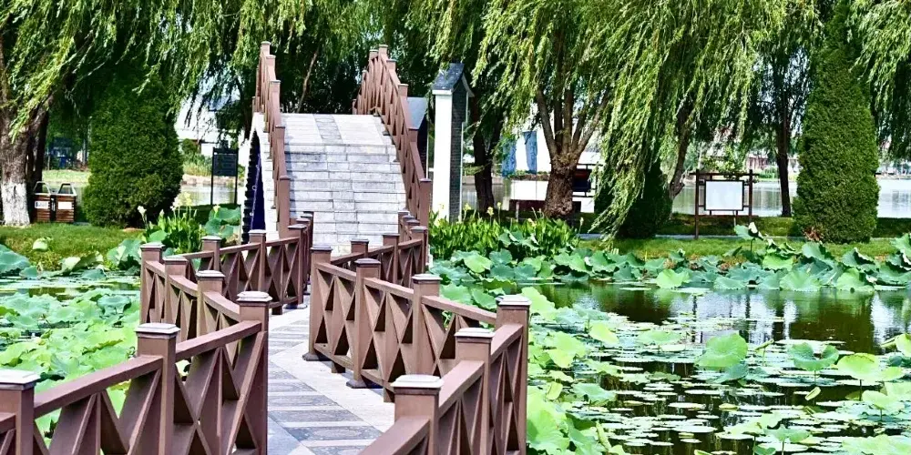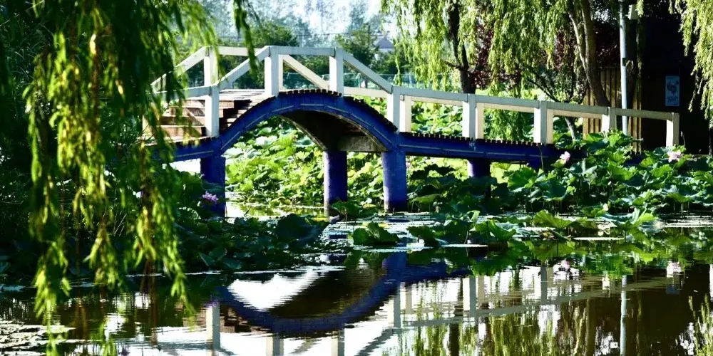 寶應荷園位於寶應縣射陽湖鎮水泗集鎮的西側,總面積近兩萬畝,其中荷藕種植面積1.5萬畝。園區內河渠縱橫,水網密佈。當遊人踏進荷園,首先映人眼簾的是由江蘇省書法家協會會員趙文瀾先生書寫在界碑上的遒勁有力的兩個大字——“荷園”。“接天蓮葉無窮碧,映日荷花別樣紅”。走在荷園橋上,便會使遊人真正感受到自己已經與“中國荷藕之鄉——寶應”親密接觸了。站在荷園岸邊,放眼望去,眼前呈現出一片浩瀚的荷花盪。在耀眼的陽光下,萬畝荷花盪的盡頭則是碧綠—片。坐落在荷花盪裏的四座風車,風葉迎風轉動,有着—種執着不阿的精神,遠遠望去,好似四衹巨大的河鳥在空中翱翔。田埂小路旁的蘆葦、蒲草、睡蓮等自然景觀更是盡收眼底,妙不可言。乘船行進在荷花盪中,則是另一種心境。船伕竹篙輕點河水,小船便如離弦的箭一樣向前飛去。